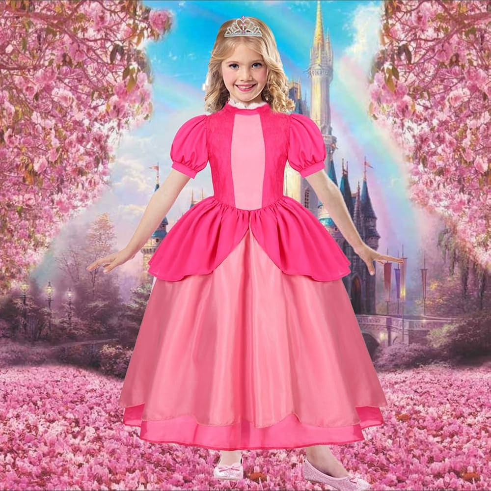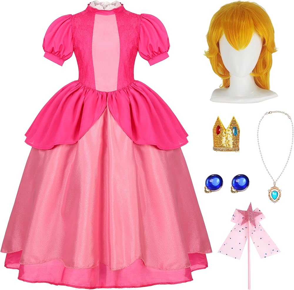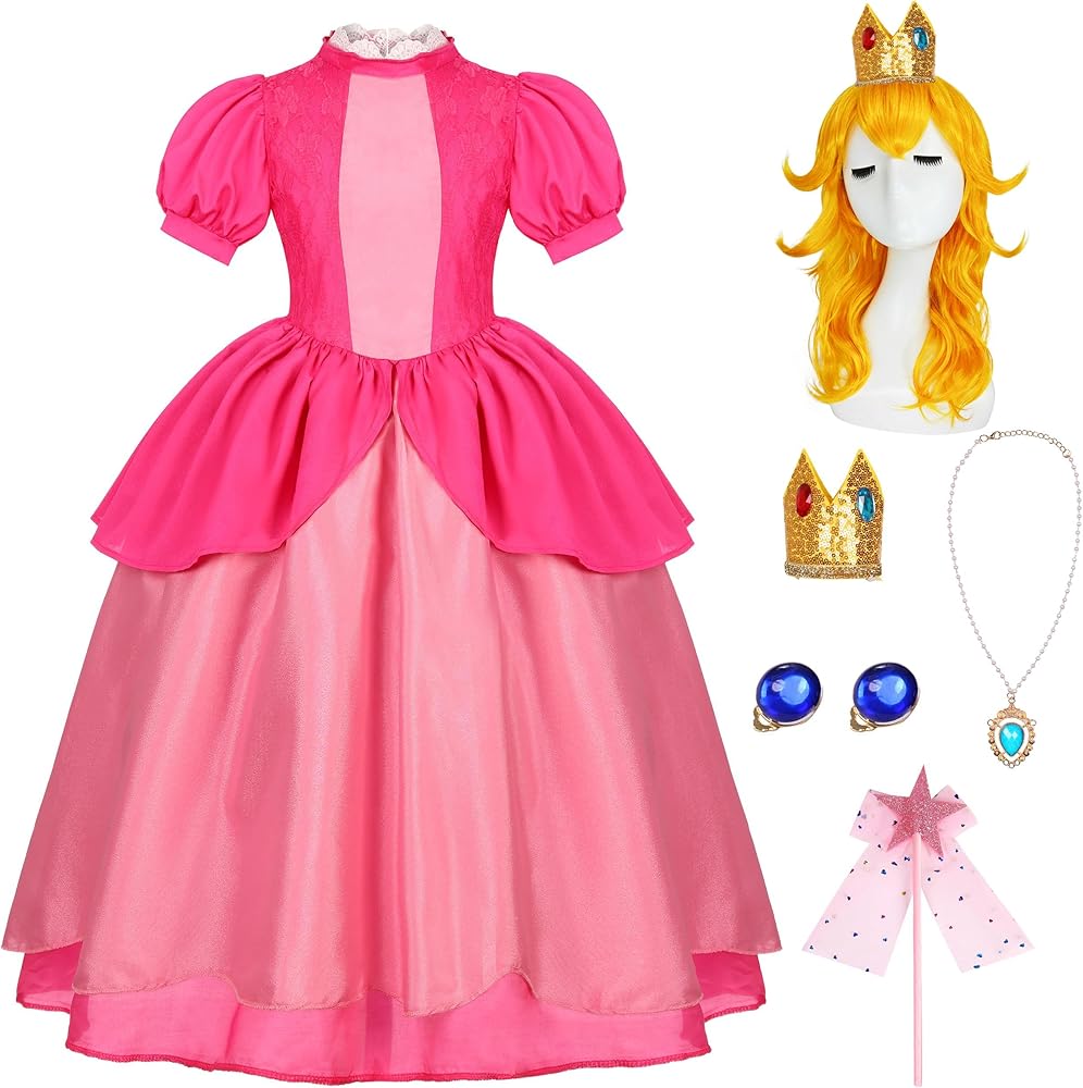 فستان تنكري للأميرة الخوخية للفتيات مع إكسسوارات شعر مستعار لأزياء الهالوين أزياء سوبر بروس التنكرية باللون الوردي