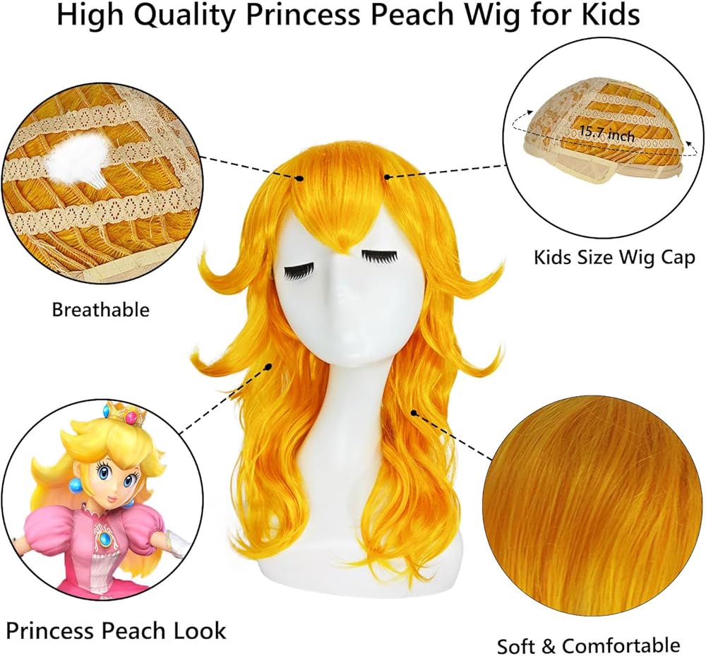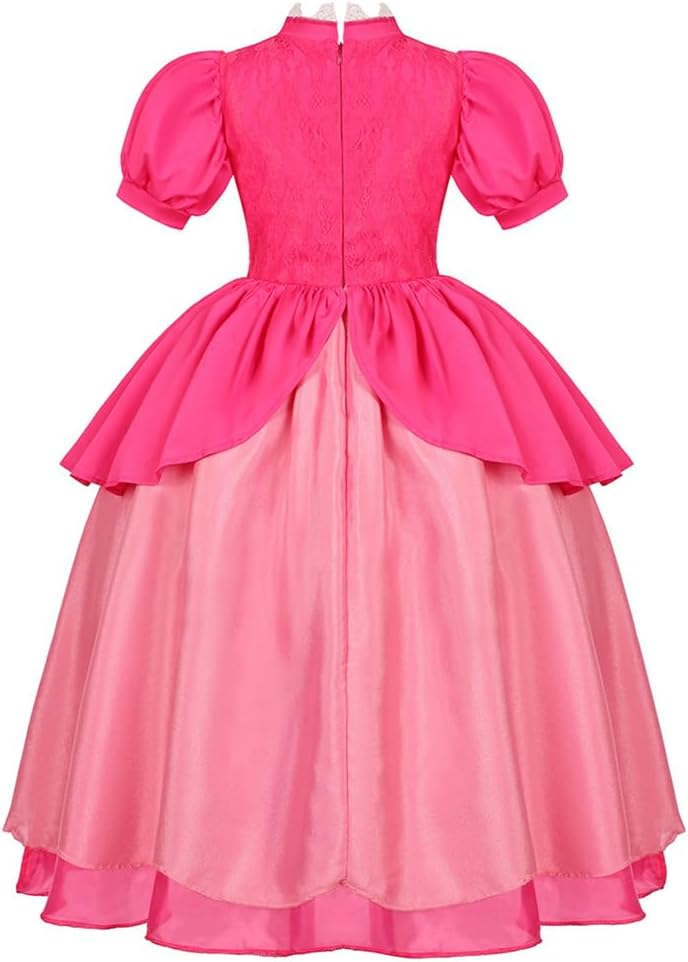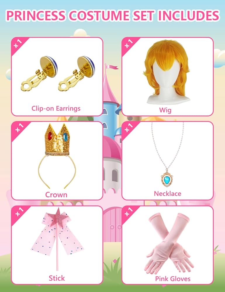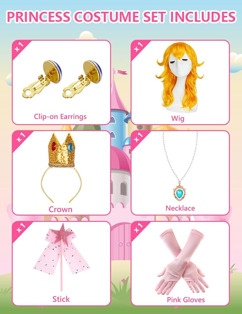 - يتضمن زي الأميرة الخوخي للفتيات: 1 × فستان الأميرة الخوخ، 1 × شعر مستعار الأميرة الخوخ، 1 × قفازات وردية، 1 × قلادة، 1 × تاج، 1 × أقراط، 1 × عصا، يحولك إلى مظهر ملكي للأميرة بيتش.
