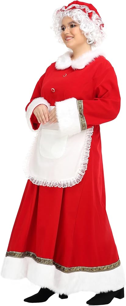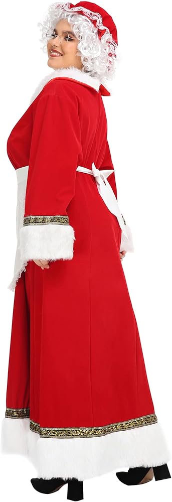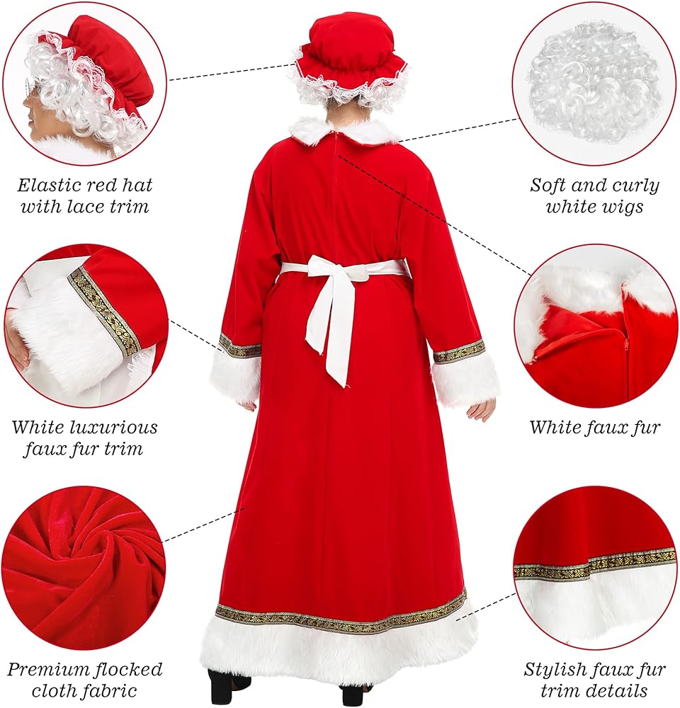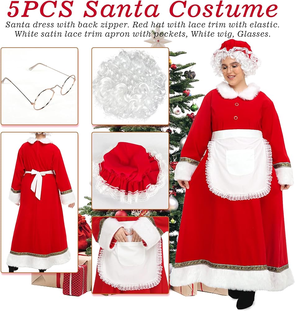 يتضمن زي السيدة كلوز 5 قطع: فستان سانتا بسحاب على الظهر لسهولة الخلع والارتداء، قبعة حمراء مع زخرفة من الدانتيل، مريلة مزخرفة من الدانتيل الأبيض مع جيوب، شعر مستعار أبيض لعيد الميلاد، نظارات.