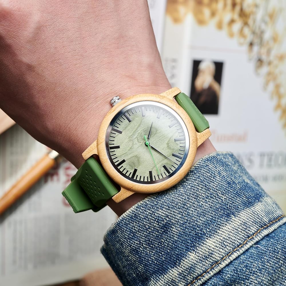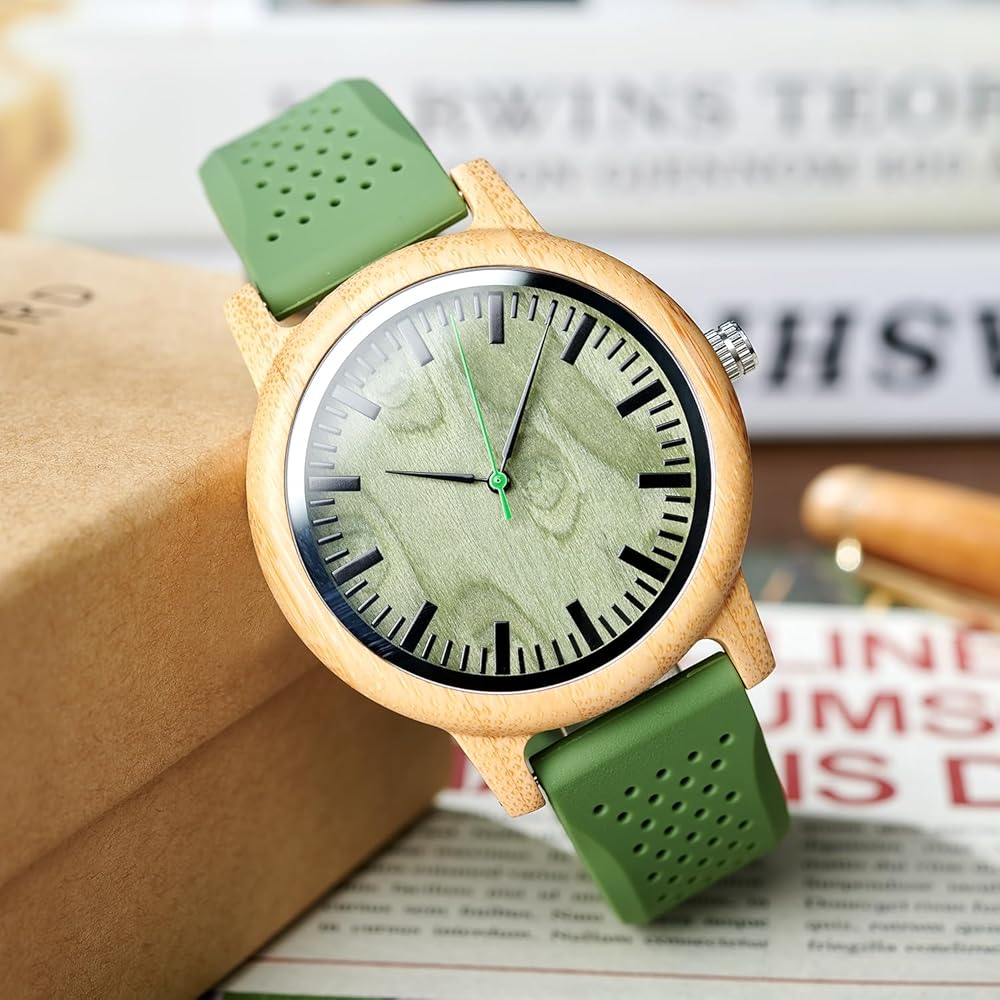 ساعة بوبو بيرد للرجال والنساء 44 ملم من خشب الخيزران المحايد الكبير للجنسين اليابان التناظرية الكوارتز الأخضر وحزام السيليكون ساعات رياضية كاجوال مع صندوق خشبي