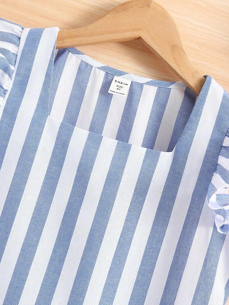 - المزايا: طباعة مخططة، زخرفة مكشكشة، رقبة مربعة، أكمام قصيرة، أكمام واسعة