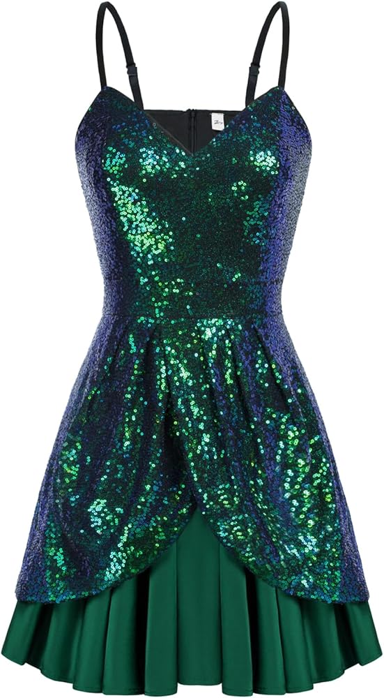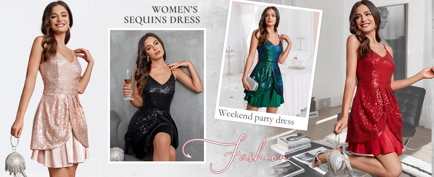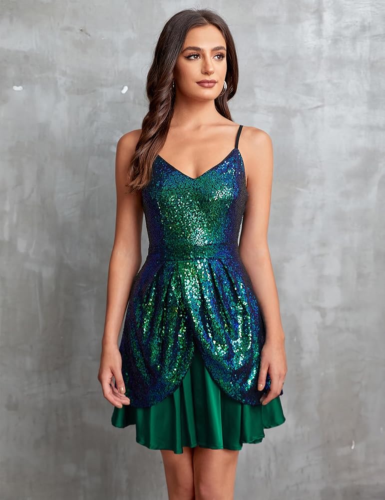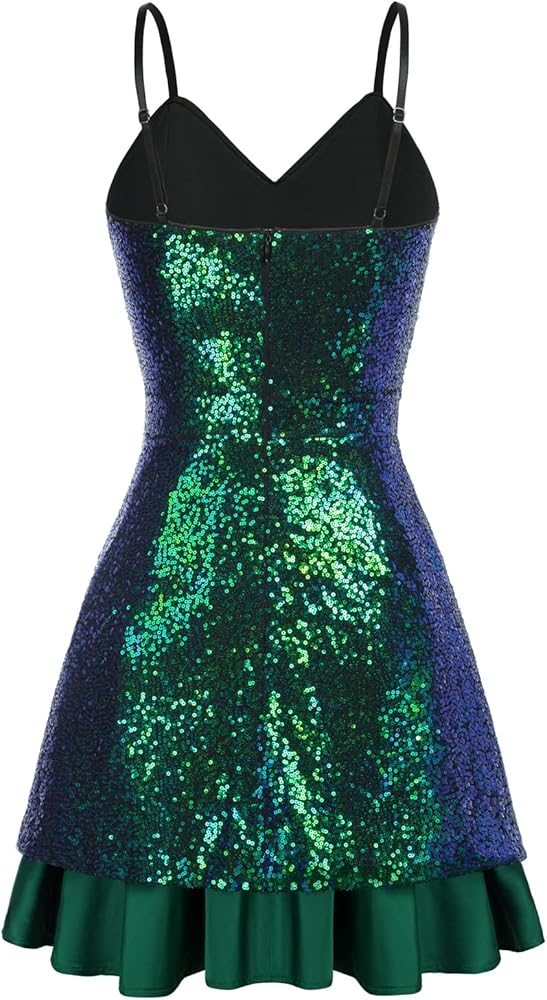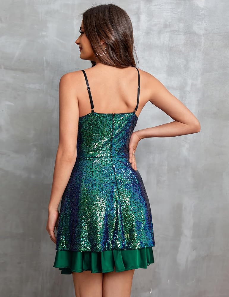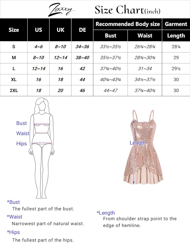 • 【التصميمات】فستان نسائي قصير مصنوع من الترتر اللامع، ونسيج مطاطي، وأشرطة سباغيتي ورقبة على شكل حرف V، وحاشية مبطنة من الساتان، وسحاب مخفي في الخلف، وطول يصل إلى فوق الركبة، ومبطن بالكامل.