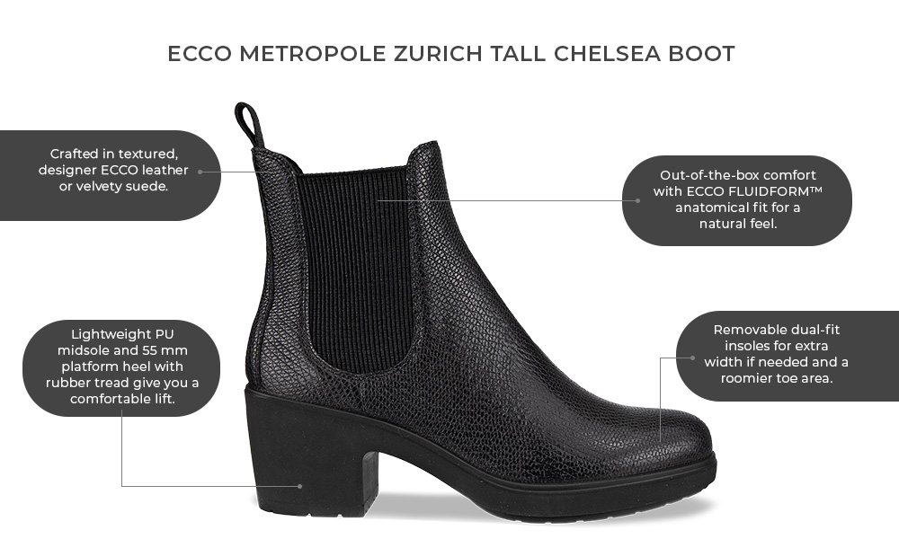 تضع ECCO معايير جديدة للراحة والأناقة والموثوقية مع أحذية ECCO METROPOLE ZURICH Chelsea. يظل حذاء تشيلسي الأيقوني على الموضة إلى الأبد بسبب تنوعه الكبير ولكن تم ترقيته ليوفر لك الراحة المميزة من ECCO. سيضفي جلد ECCO المزخرف الخاص بالحذاء عنصرًا مميزًا على مظهرك. توفر لك الجوانب المطاطية المعززة وعروات السحب إمكانية الارتداء والخلع بسهولة. سيمنحك كعبه الأساسي الذي يبلغ طوله 55 ملم ارتفاعًا رشيقًا. ارتديها مع فستان ماكسي انسيابي أو بنطال واسع لإبراز التصميم الراقي.