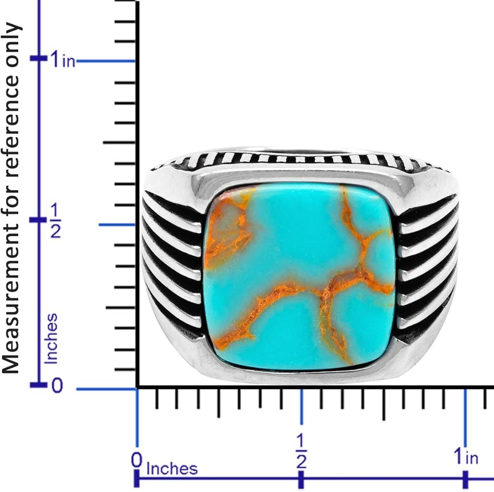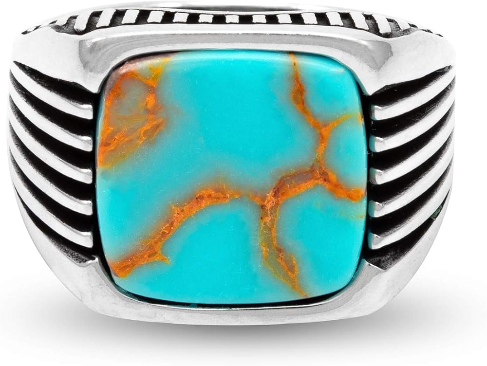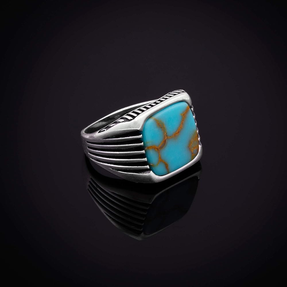 نموذجنا عبارة عن خاتم من الفضة الإسترلينية النقية ذو الطراز المعاصر مع أحجار كريمة فيروزية عتيقة كبيرة ذات قمة مسطحة ومربعة ومستقرة. الخاتم مصنوع من الفضة الإسترليني الصلبة وعليه ختم 925. يحتوي الجسم على خطوط محفورة على كلا الجانبين. التجاويف المؤكسدة تجعل السطح المصقول أكثر بروزًا، مما يسمح بالتعرف على الحلقة بسهولة. يناسب تمامًا أنواع الملابس الذكية الكاجوال وغير الرسمية. يأتي منتجنا مع صندوق هدايا وحقيبة حمل ويمكن أن يكون هدية مثالية لك أو لأحبائك في جميع المناسبات مثل الزواج والصداقة والذكرى السنوية وأعياد الميلاد وعيد الأب والاحتفالات.