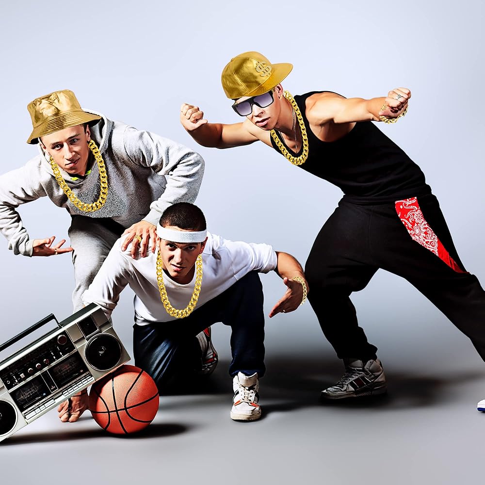 ★【80s/90s Party Supplies】- Our hip hop costume kit includes 1 piece flat-brimmed gold hat, 1piece 35 inch fake gold plastic chain, 1 piece faux gold bracelet, 1 piece gold dollar sign finger ring, 1 piece unisex hip hop sunglasses, 1 pair hip hop earrings, Our classic retro style is the best choice for your 80s/90s hip-hop party.