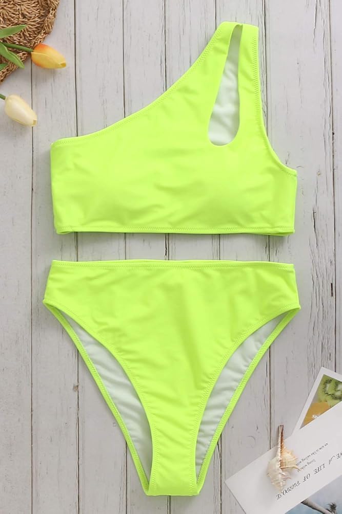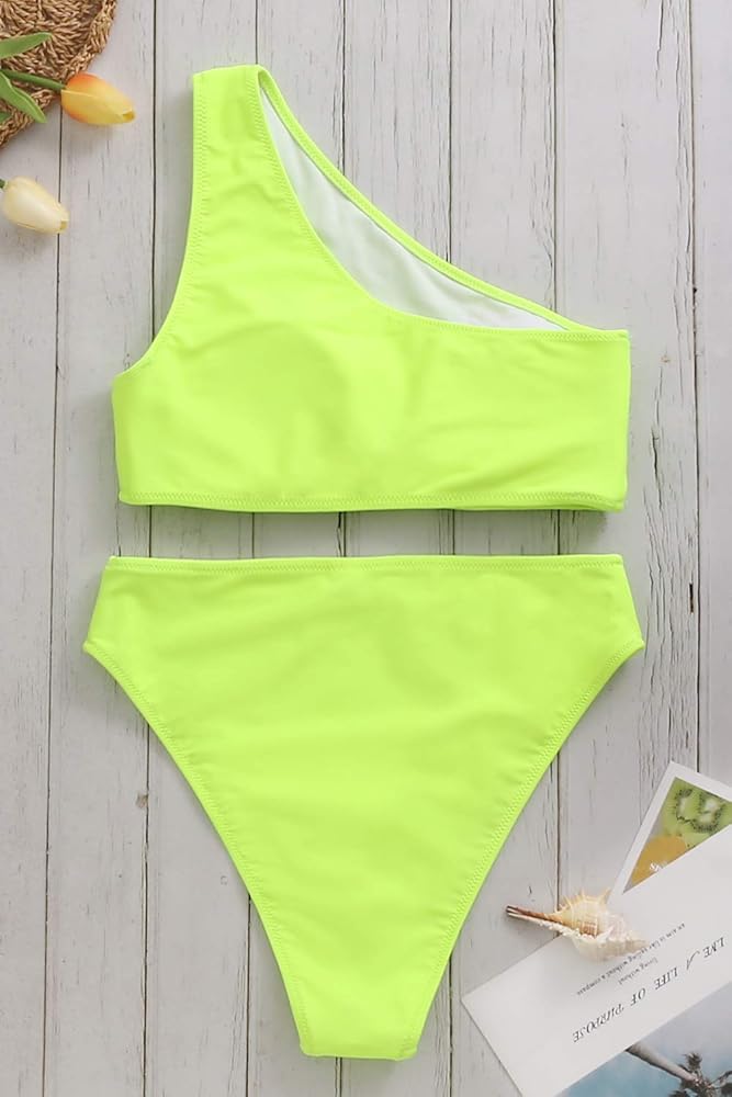 بدلة استحمام رياضية عالية الخصر بكتف واحد. بين الجزء العلوي القصير العصري والتغطية الرائعة في الجزء السفلي عالي الخصر، يتميز الجزء العلوي من البكيني ذو الخصر المرتفع بشكل رياضي قليلاً، في حين أن الملابس الداخلية ذات قصة عالية مثل قطعتين من الثمانينيات .ارتفاع مناسب وتغطية متوسطة، تصميم الخصر العالي بكتف واحد باللون الوردي الفاقع يوفر تحكمًا جيدًا في البطن، مجموعة البيكيني عالية الخصر المثالية، مع شعور حسي ورياضي يجعل ملابس السباحة ذات الكتف الواحد لا تقاوم ببساطة!