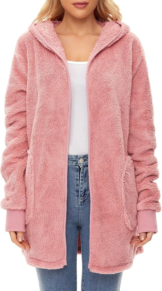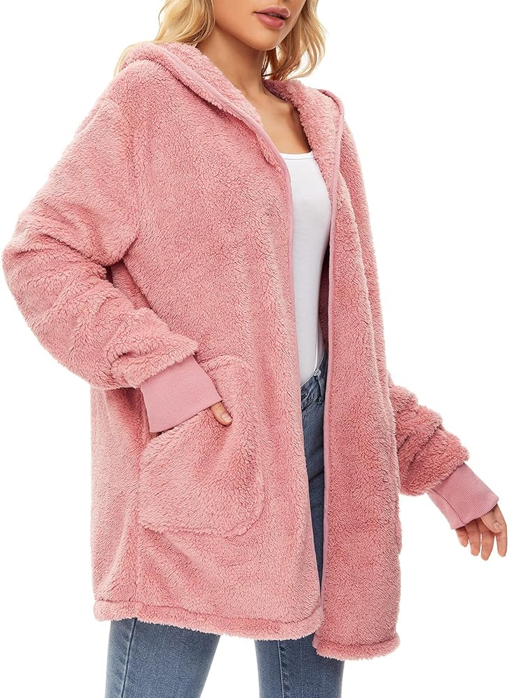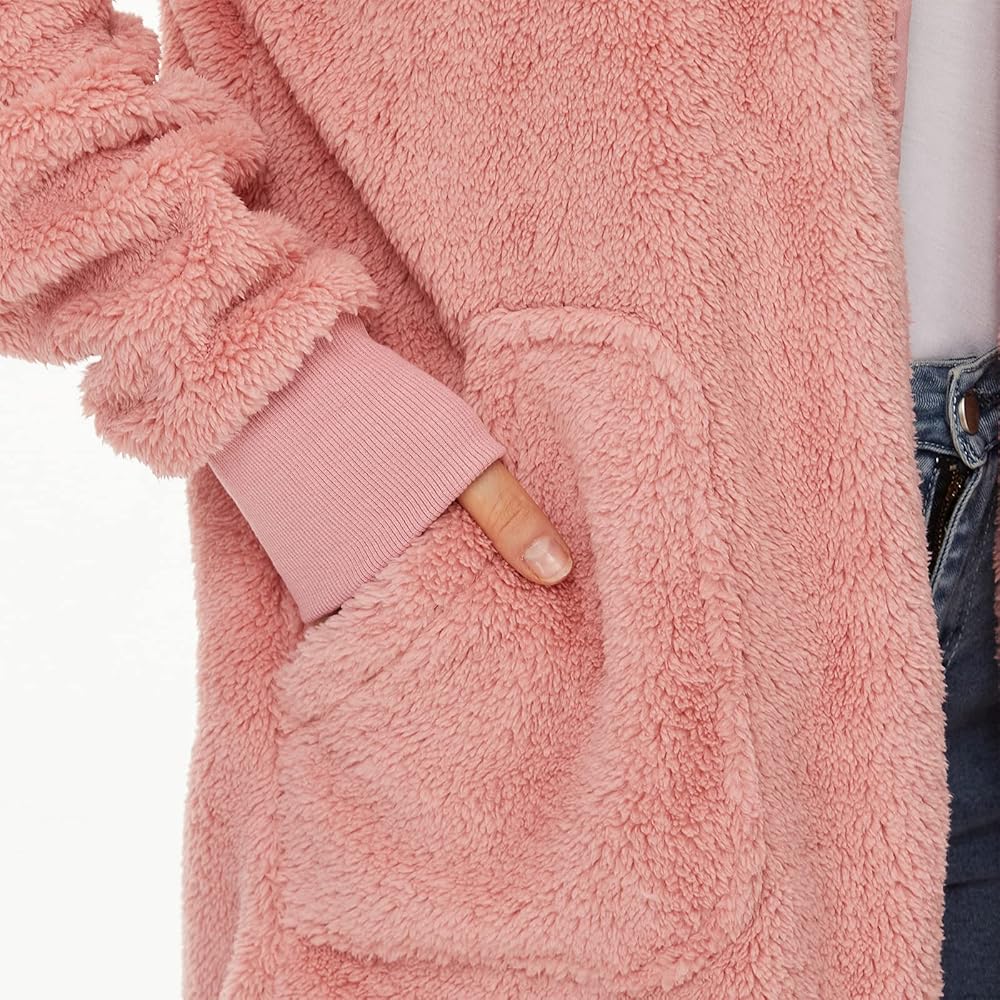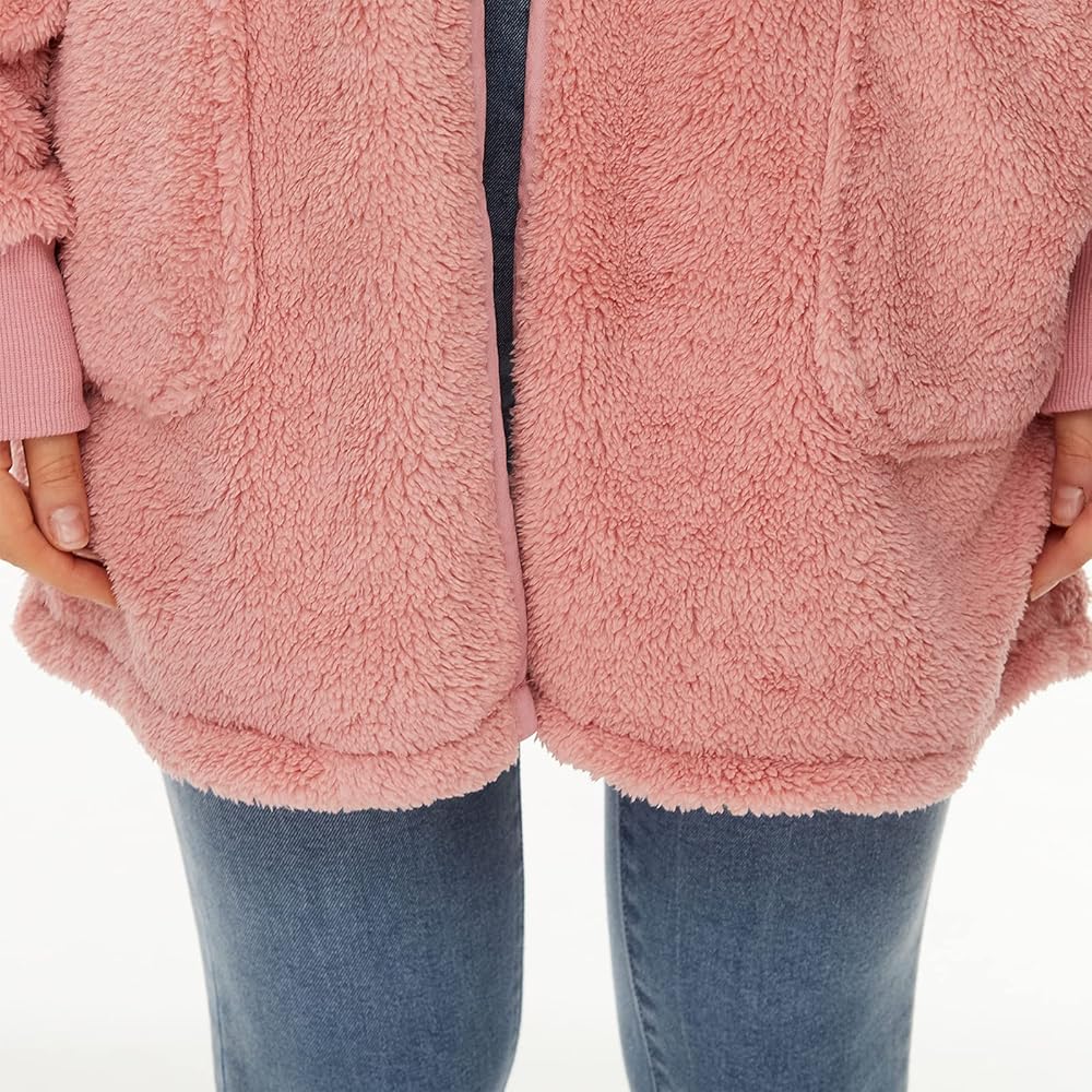 الاتجاهات الأمريكية المرأة سترة الصوف خفيفة الوزن سترة طويلة البلوزات المتضخم غامض الخريف شيربا هوديي مع جيوب معطف فروي دافئ