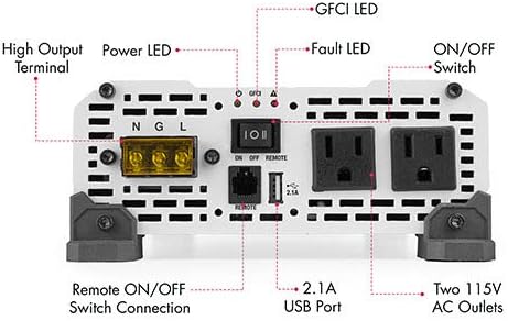 شحن سريع - منفذا تيار متردد محميان بخطأ أرضي ثلاثي الشقوق (NEMA 5-15)، مفتاح طاقة ثلاثي المواضع (تشغيل > إيقاف > جهاز تحكم عن بعد)، 2. منفذ طاقة USB 1 أمبير، مصابيح الطاقة والخطأ، أقدام تثبيت صلبة