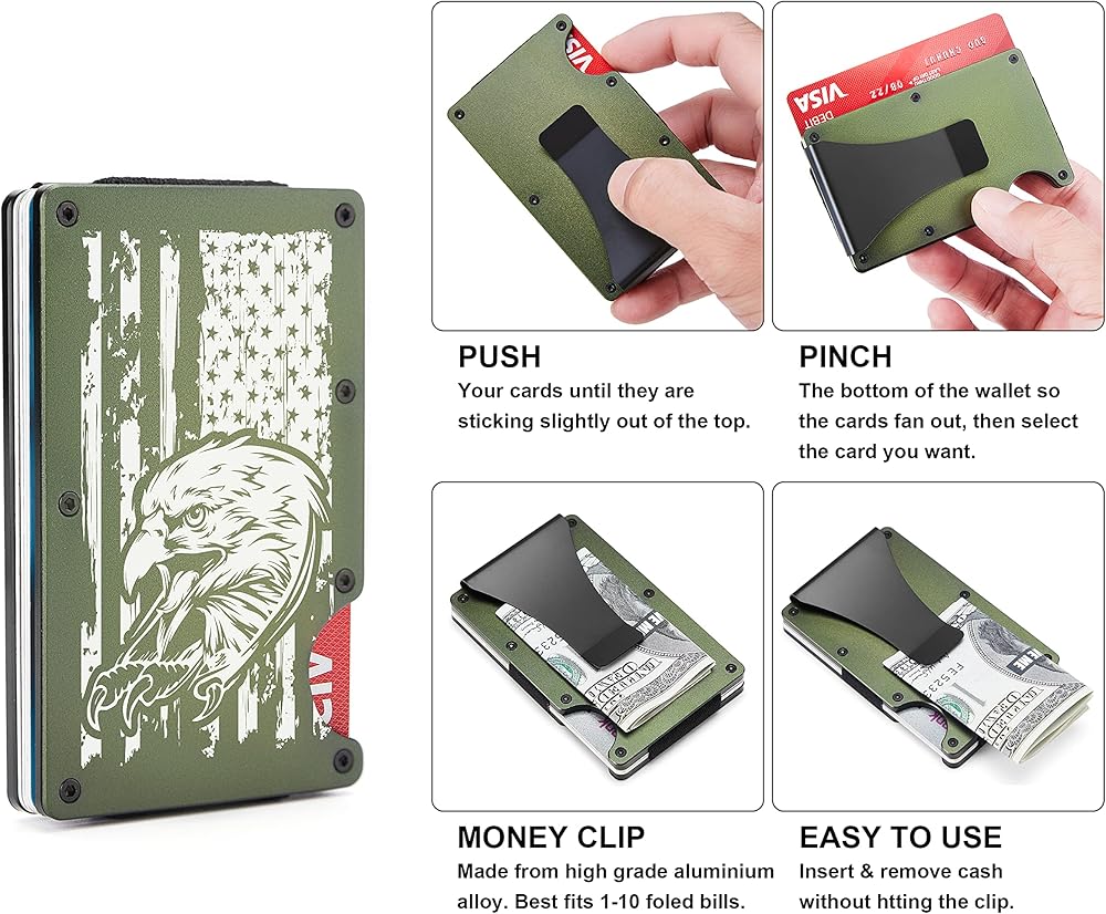 محفظة معدنية نحيفة: 0.91 × 1.42 × 0.43 بوصة. يمكنها حمل 12 بطاقة. يمكن أن يساعدك التصميم المريح على اختيار البطاقة التي تحتاجها بسهولة أكبر. مشبك نقود متين من الفولاذ المقاوم للصدأ 304 على الظهر يجعله حتى لا تضطر إلى حمل فواتيرك في جيبك.