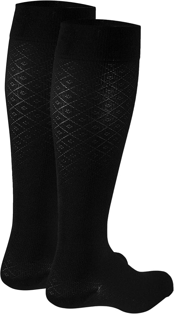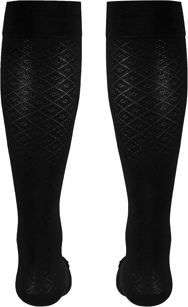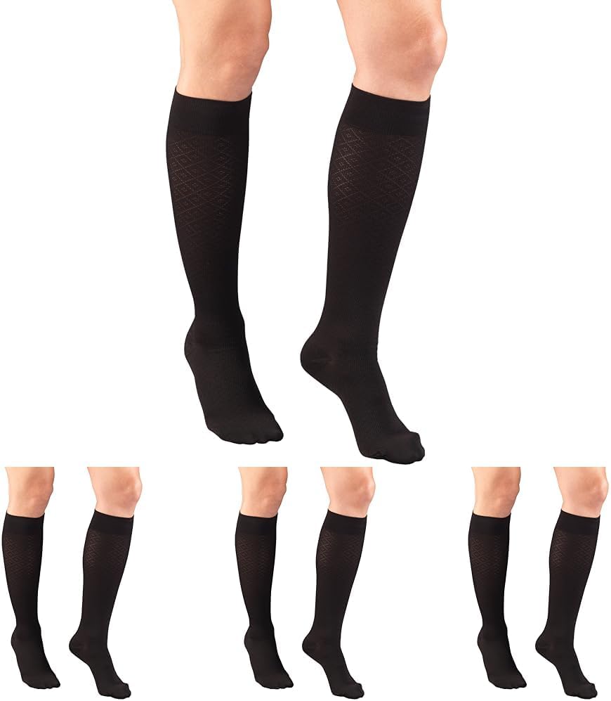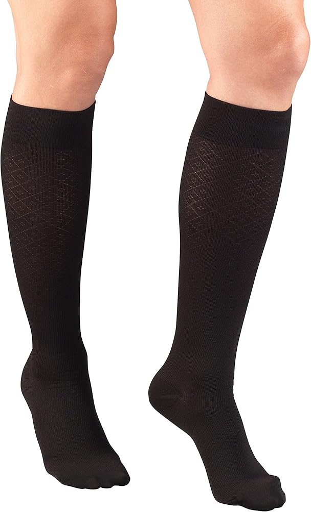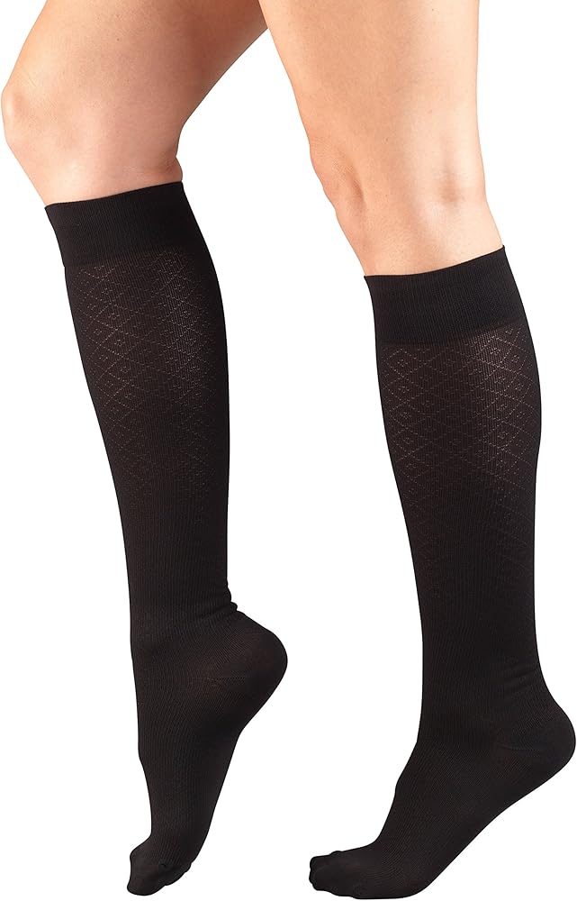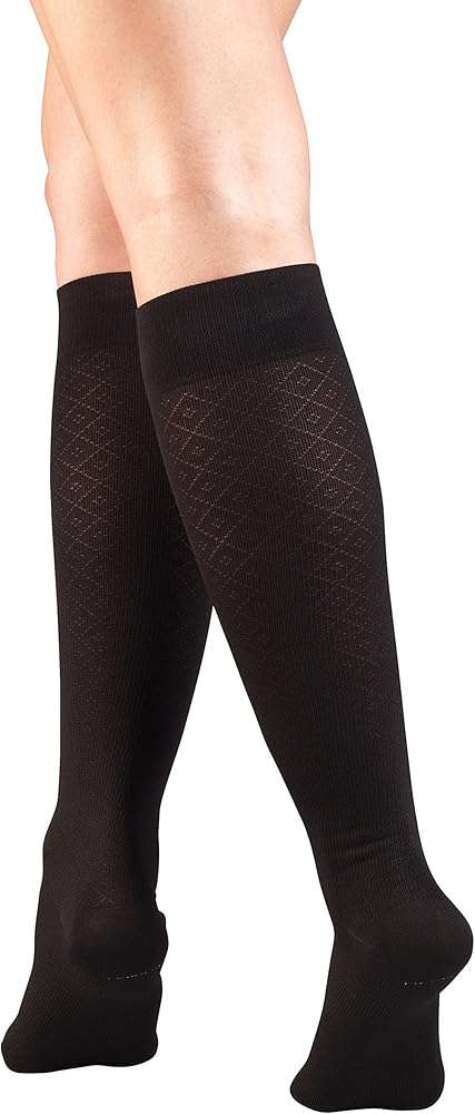جوارب الضغط الأنيقة المنقوشة للنساء من تروفورم توفر دعمًا طبيًا بضغط بمقدار 15-20 مم زئبق وتتميز بتفاصيل تصميم منقوشة منسوجة.