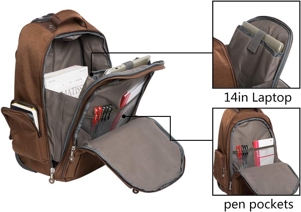 الكثير من الجيوب. مساحة تخزين سميكة مبطنة بالفوم في شنطة الظهر الدوارة هذه كبيرة بما يكفي لحمل لابتوب مقاس 14 انش. يمكن للجيب الخارجي حمل الأشياء الضرورية اليومية مثل المفاتيح والأقلام والفلاش.