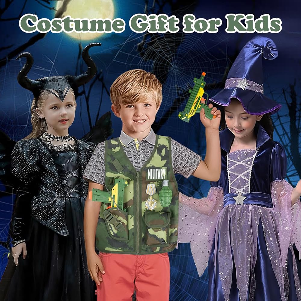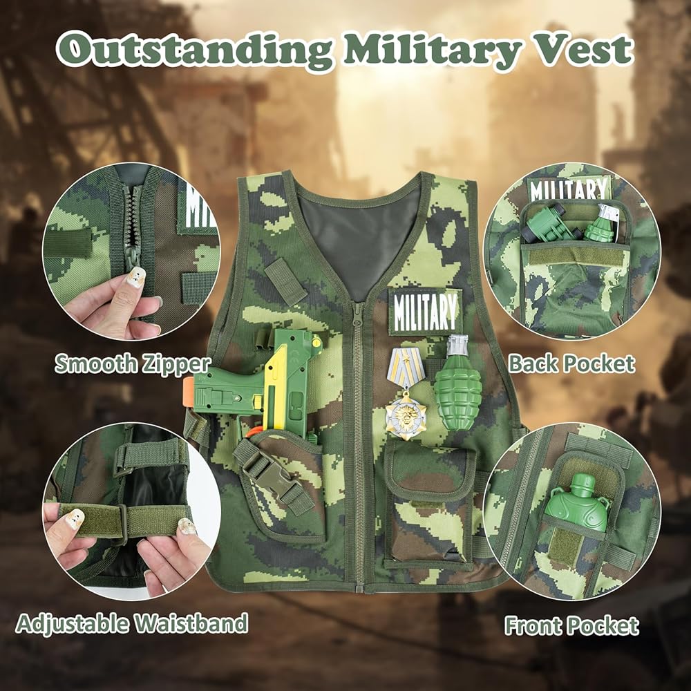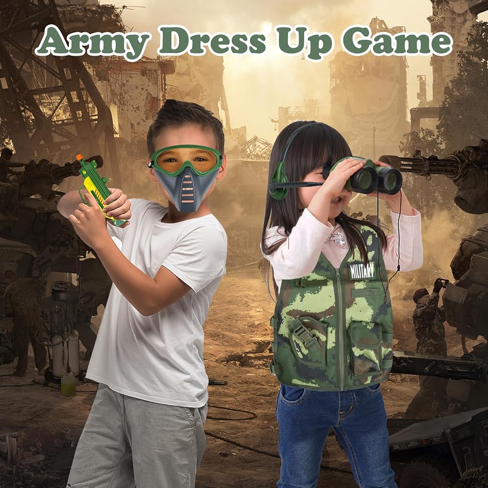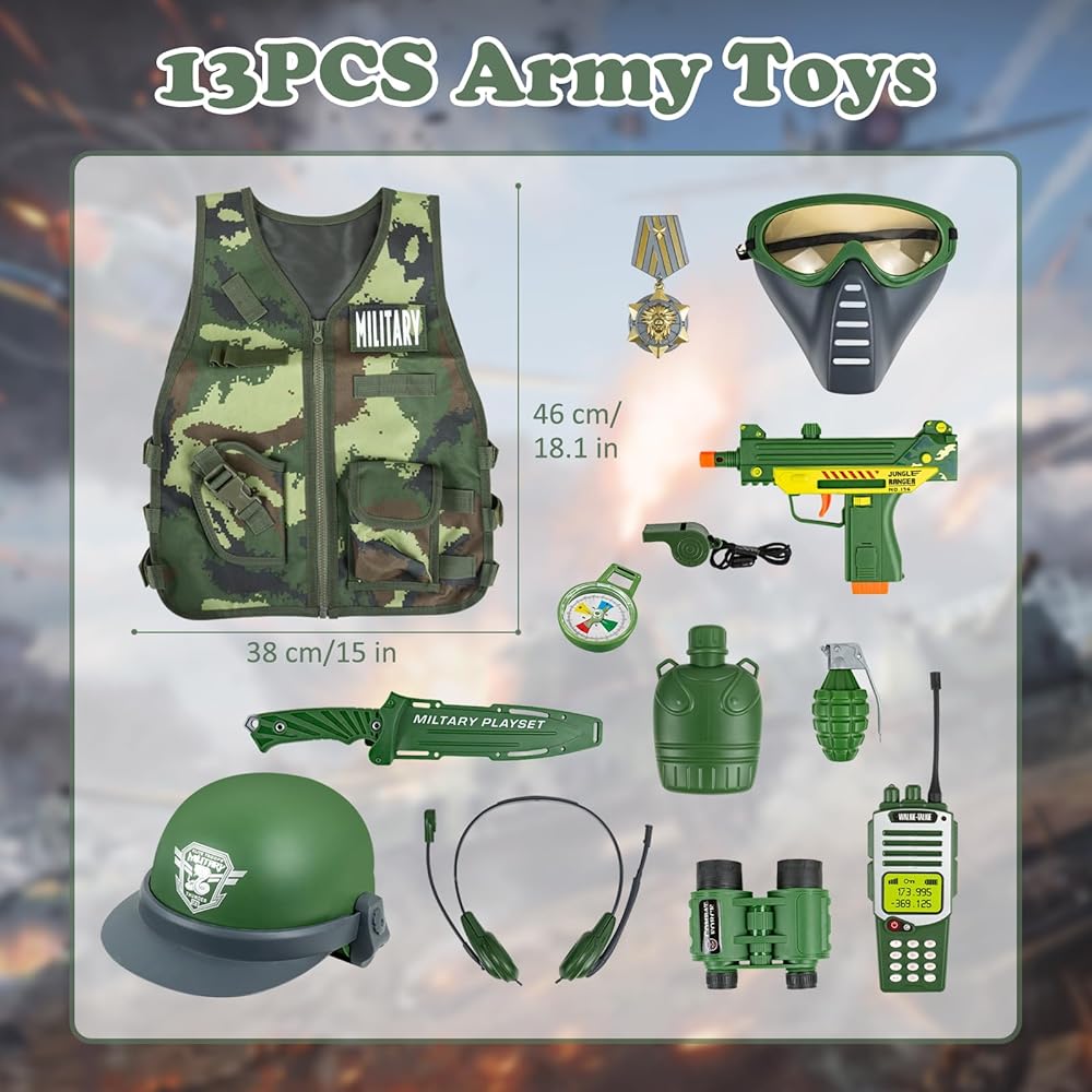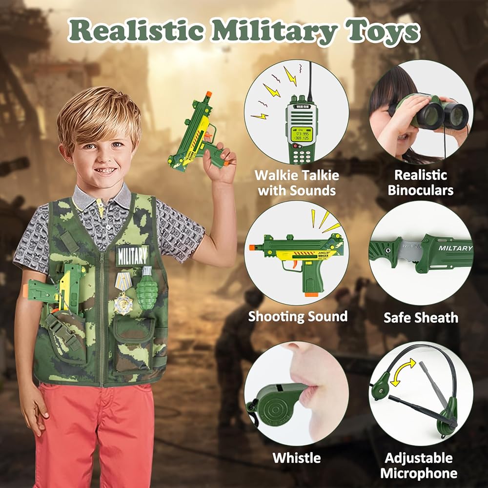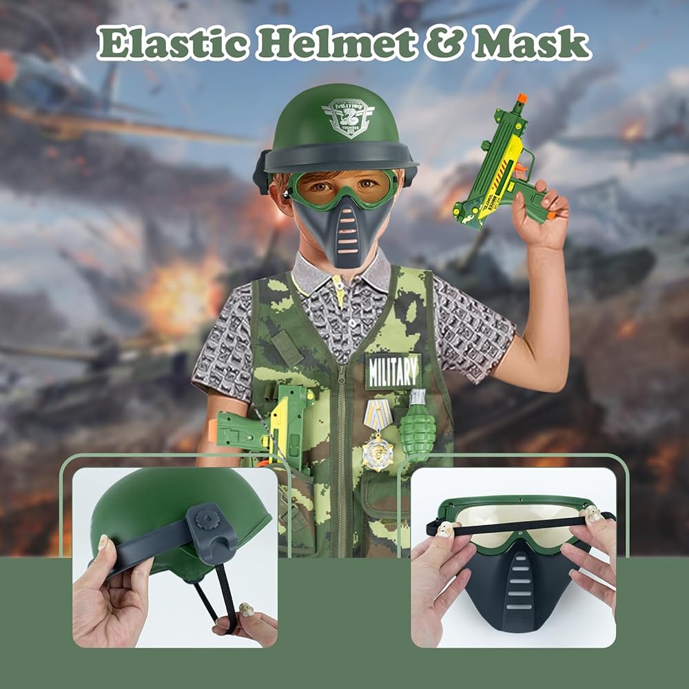 • 🪖【مجموعة كاملة من ملحقات الألعاب العسكرية】تحتوي مجموعة ألعاب الجيش على سترة عسكرية، وخوذة عسكرية، وقناع، وسماعات رأس، وأجهزة اتصال لاسلكية، ومناظير، وصفارة والعديد من الملحقات الكاملة الأخرى. يرتدي الأطفال زي جندي ويستخدمون الخيال للمشاركة في المغامرات والمهام باستخدام هذه الدعائم الواقعية.