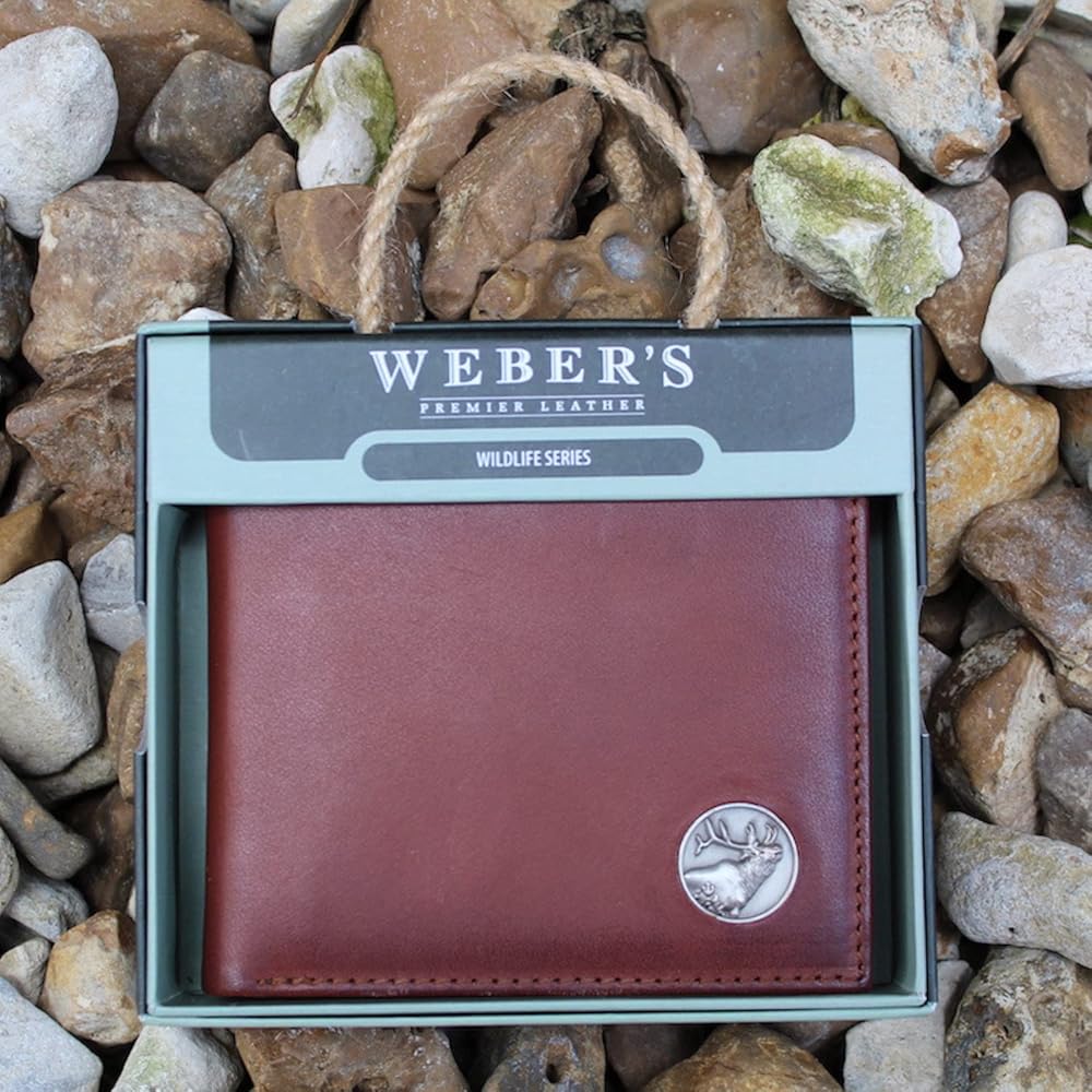 تتميز محفظة ويبر المصنوعة من الجلد الأصلي للحياة البرية بوجود كونشو مميز من الزنك في الزاوية اليمنى السفلية الأمامية. تتميز المحفظة الداخلية المصنوعة من الجلد بالكامل بغطاء فريد من نوعه ذو رؤية واضحة على الوجهين، وثلاثة عشر جيبًا للتخزين الإجمالي ومقسمًا كاملاً للفواتير.
