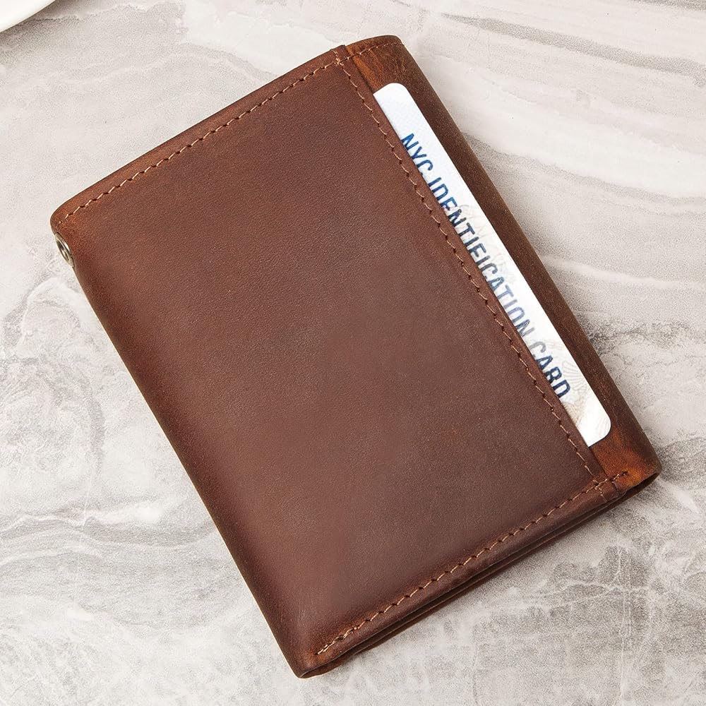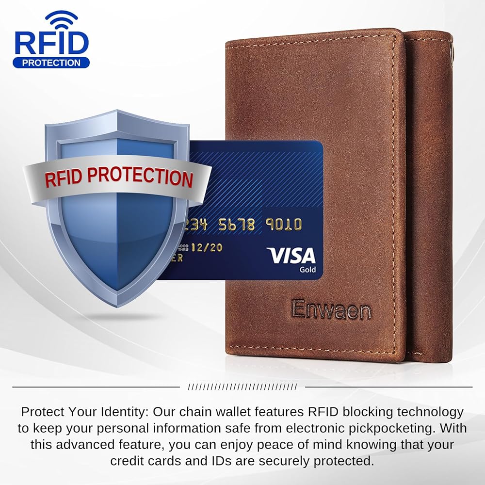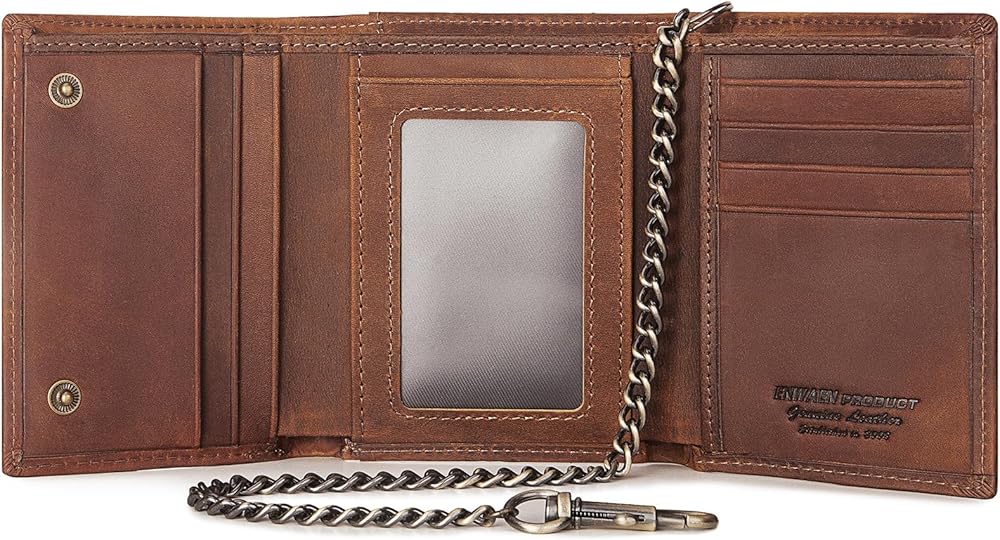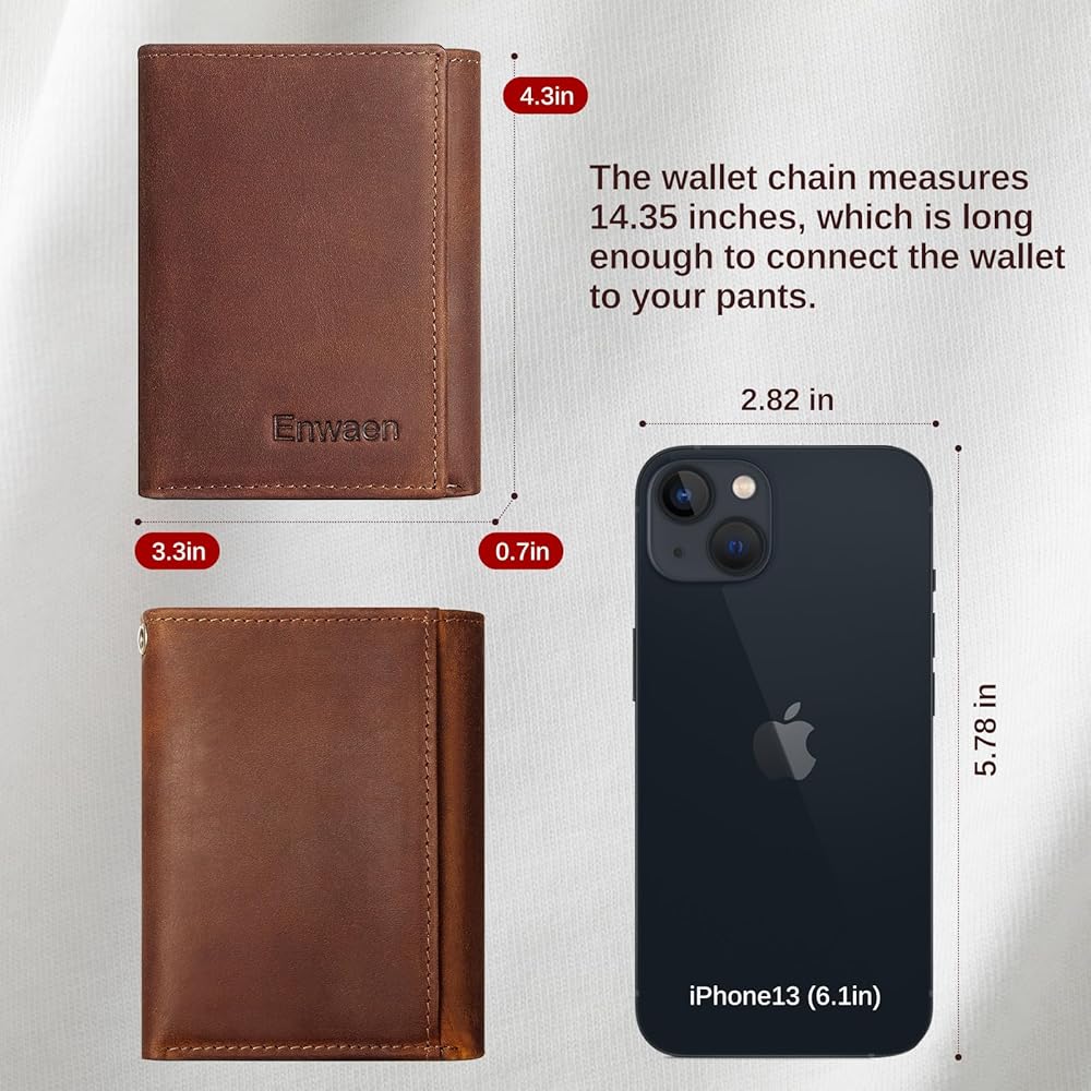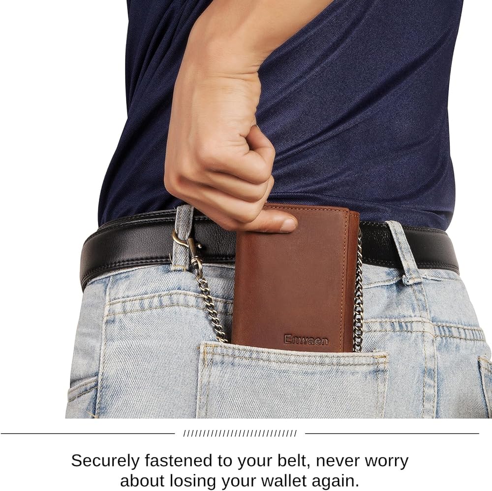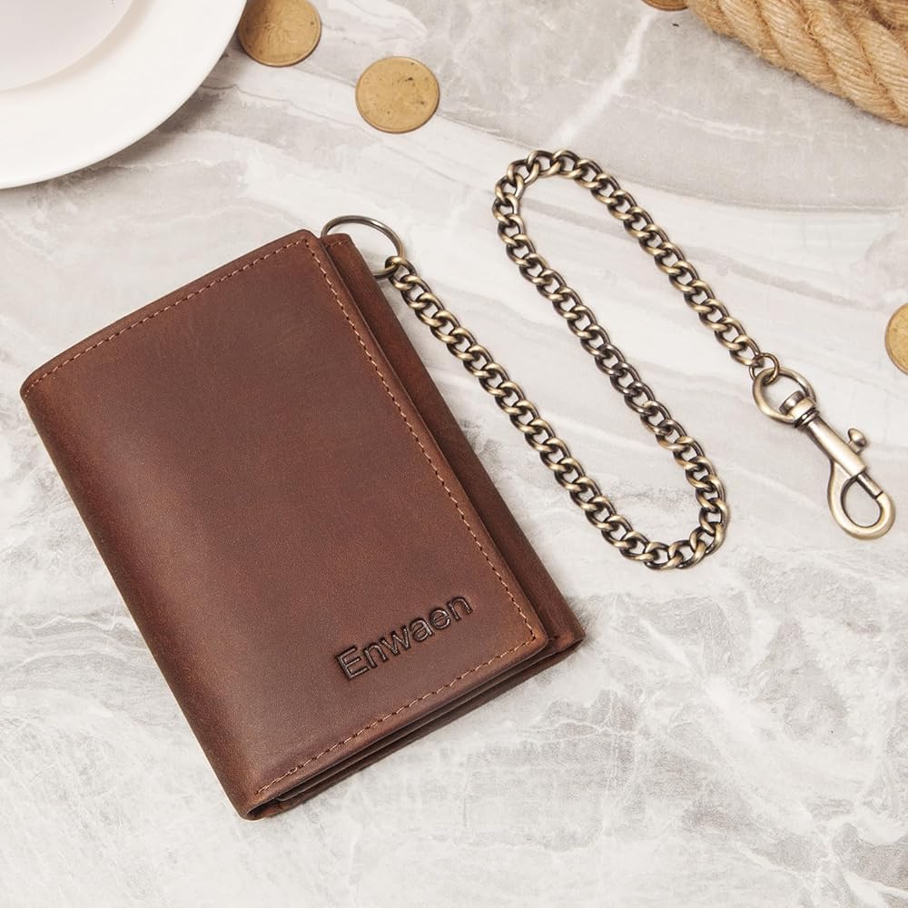 محافظ سلسلة Enwaen للرجال، محفظة ثلاثية الطي من الجلد الطبيعي من Crazy Horse مع خاصية تحديد الهوية بموجات الراديو وسلسلة مضادة للسرقة لراكبي الدراجات النارية والدراجات النارية