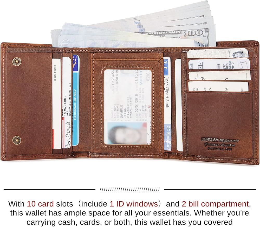 • Spacious Capacity: This wallet boasts ample storage space with 10 card slots, 1 ID card slot, and 2 bill compartments, allowing you to neatly organize and carry your credit cards, ID, and cash.