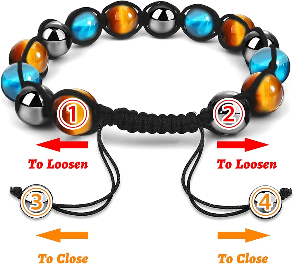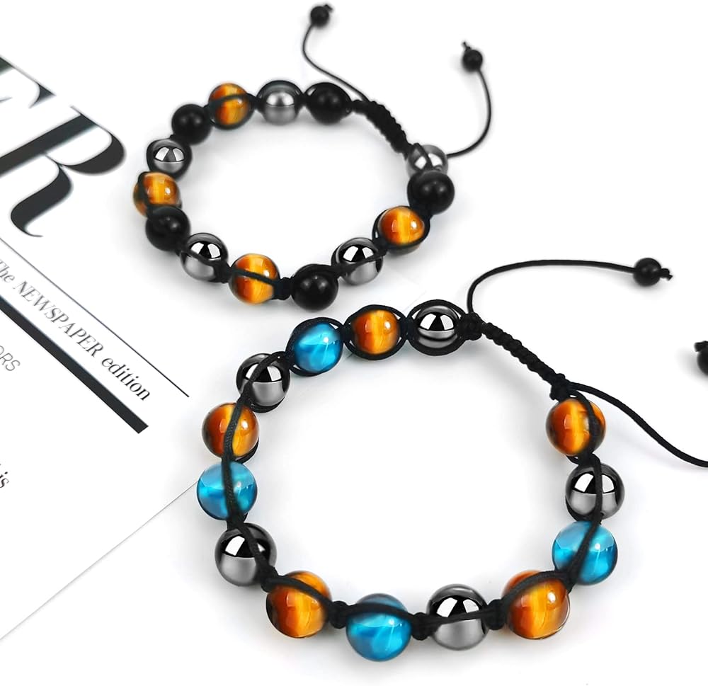 • تصميم فريد: أحد أساور الحماية الثلاثية يستخدم أحجار عين النمر وأحجار الزجاج البركاني الأسود وخرز حجر الهيماتيت. سوار الحماية الثلاثي الآخر يستخدم أحجار عين النمر وأحجار عين النمر الزرقاء وخرز حجر الهيماتيت. كل حجر كريستال ملفوف لأعلى وأسفل بحبل من النايلون، مما يجعل السوار أكثر متانة.