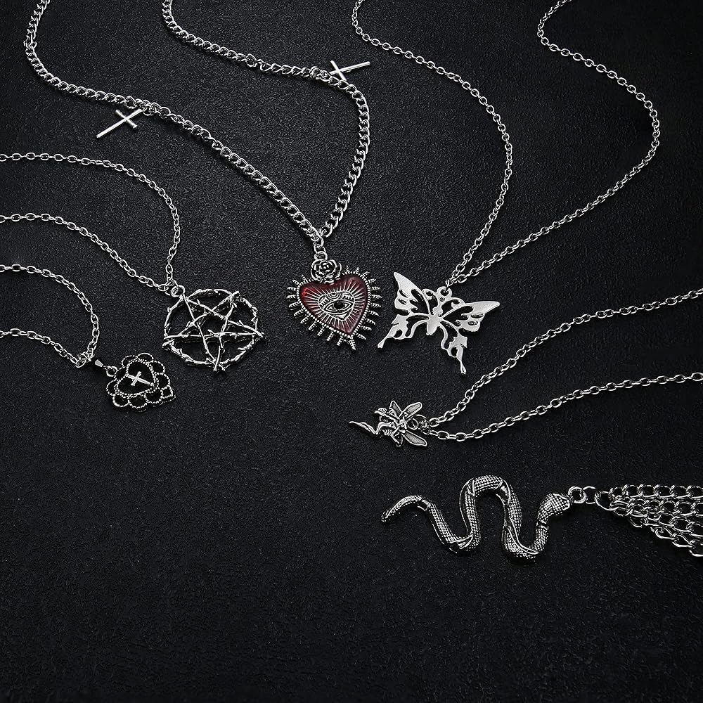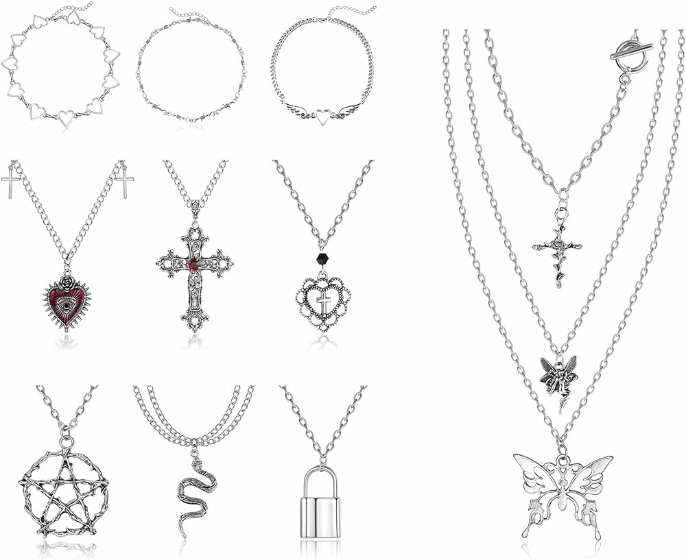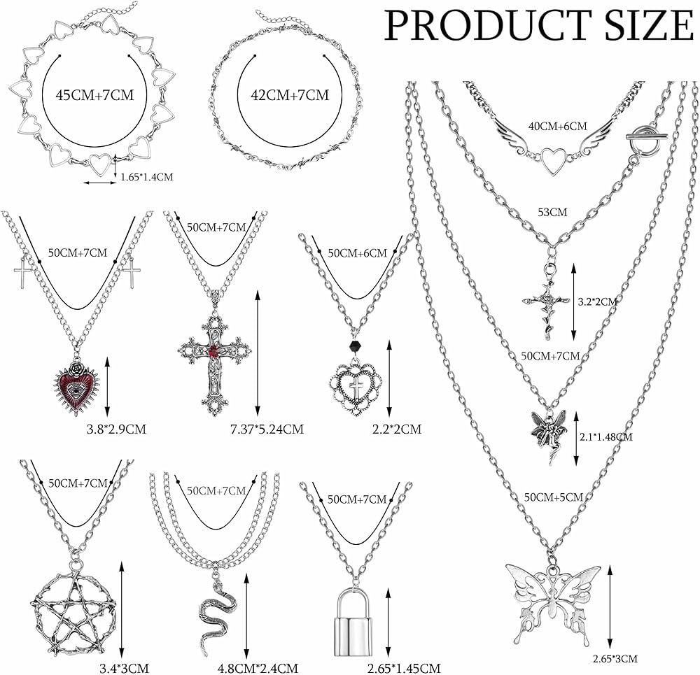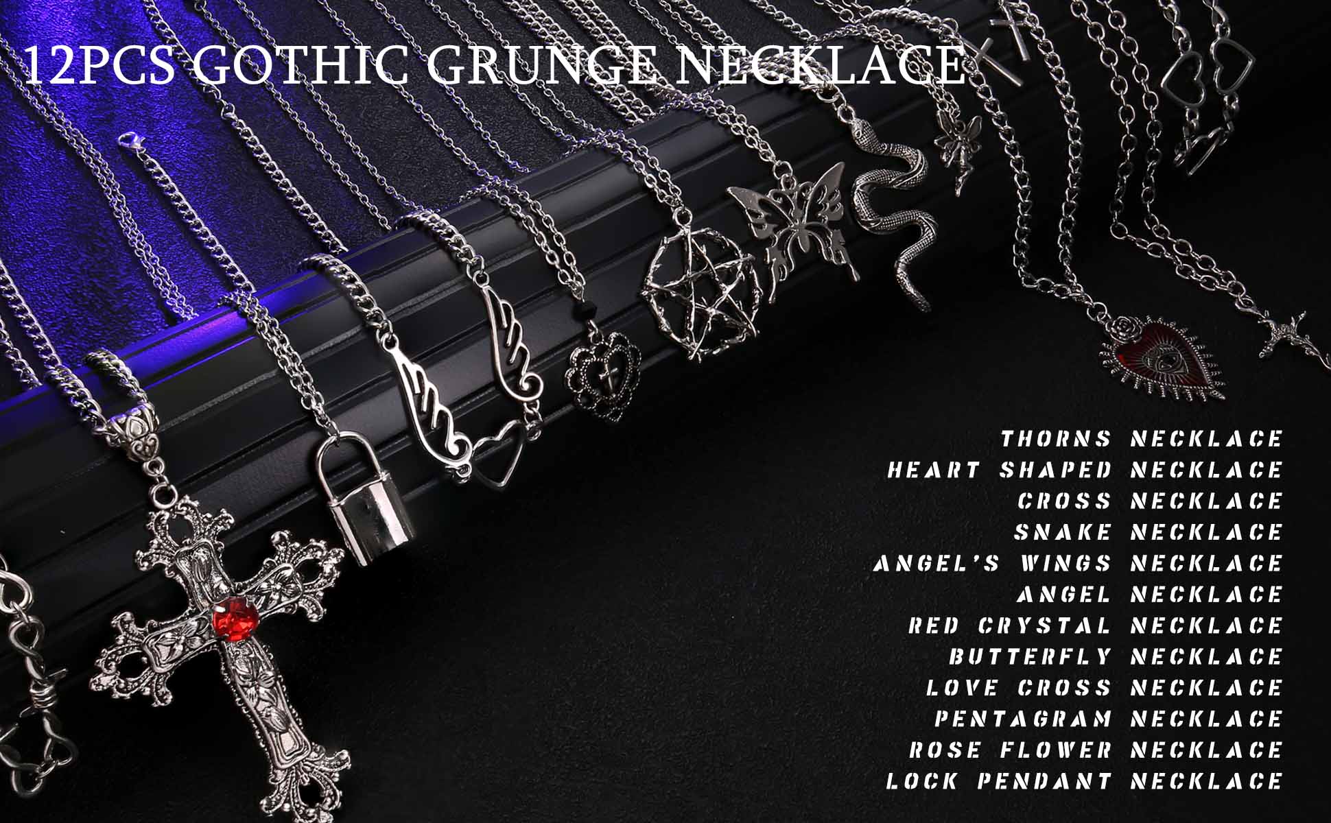 ☸مجموعة قلادات الجرونج مكونة من 12 قطعة☸ طلب واحد يحتوي على 12 قطعة من قلادات Y2K القوطية، بما في ذلك قلادة الأشواك، وقلادة متقاطعة عتيقة، وقلادة ثعبان، وقلادة ملاك، وقلادة خماسية سوداء، وقلادة بدلاية على شكل فراشة، وقلادة صليب الحب وغيرها من القلائد الشريرة. تلبي الاحتياجات اليومية المختلفة، مليئة بالروعة والرجعية والشخصية.