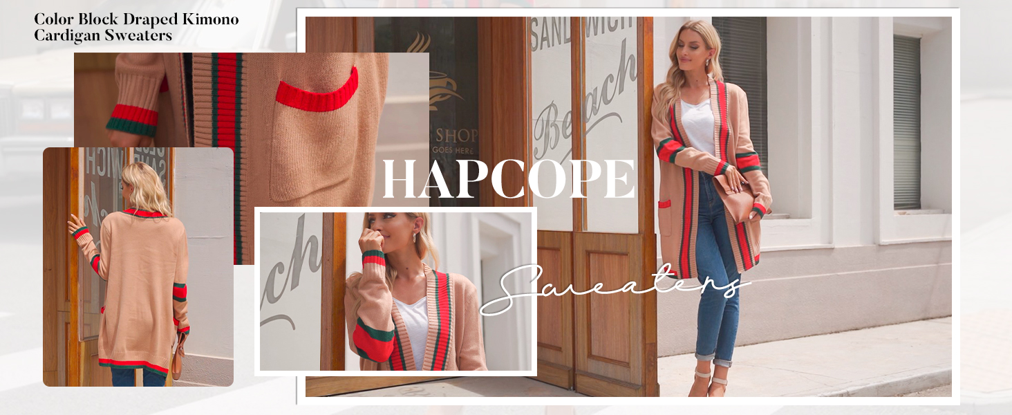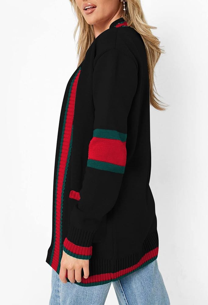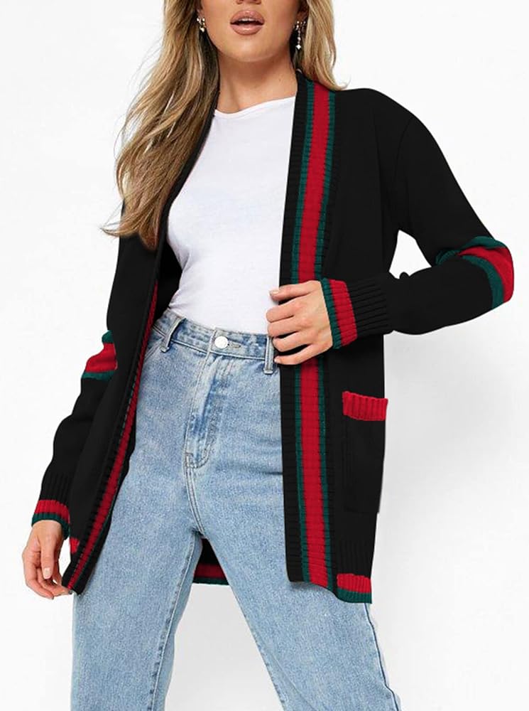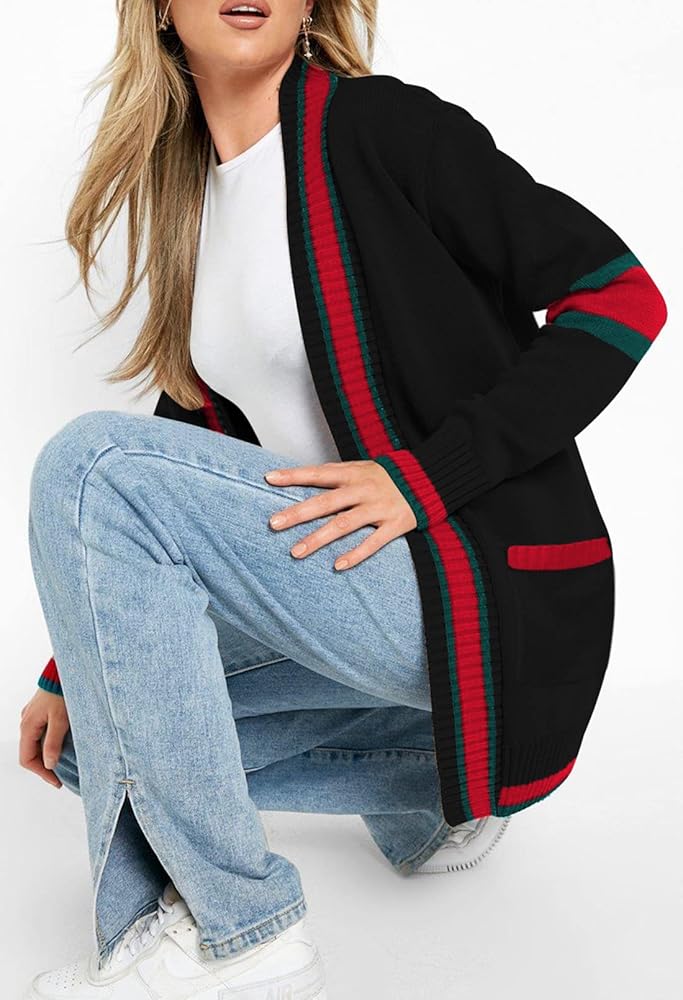 سترة كارديجان محبوكة كبيرة الحجم تتميز بأكمام طويلة، مقاس كاجوال فضفاض، طول متوسط، شريط متباين وتصميم كيمونو مفتوح من الأمام.
