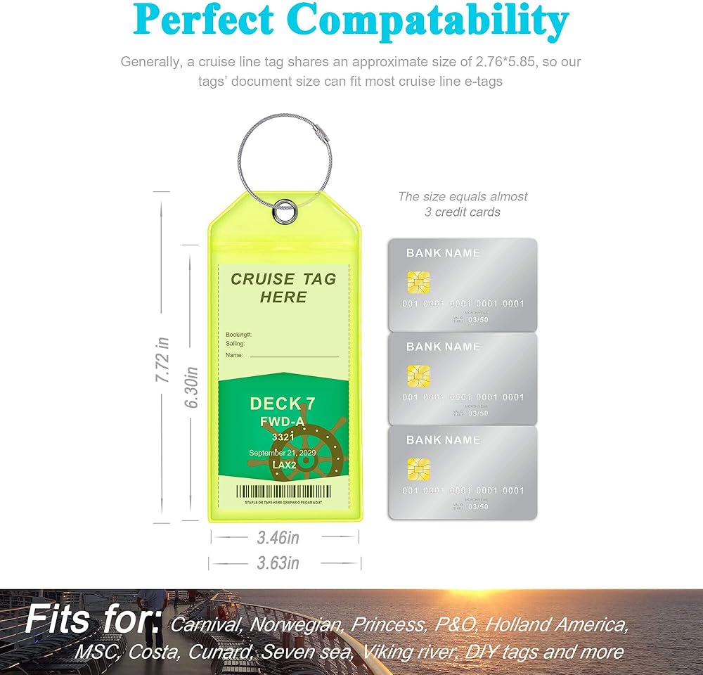 Our tags inside is 6.3 * 3.46 in, outer dimension is 7.72 * 3.63 in, easier to install/ hold paper boarding passes issued by cruise lines.