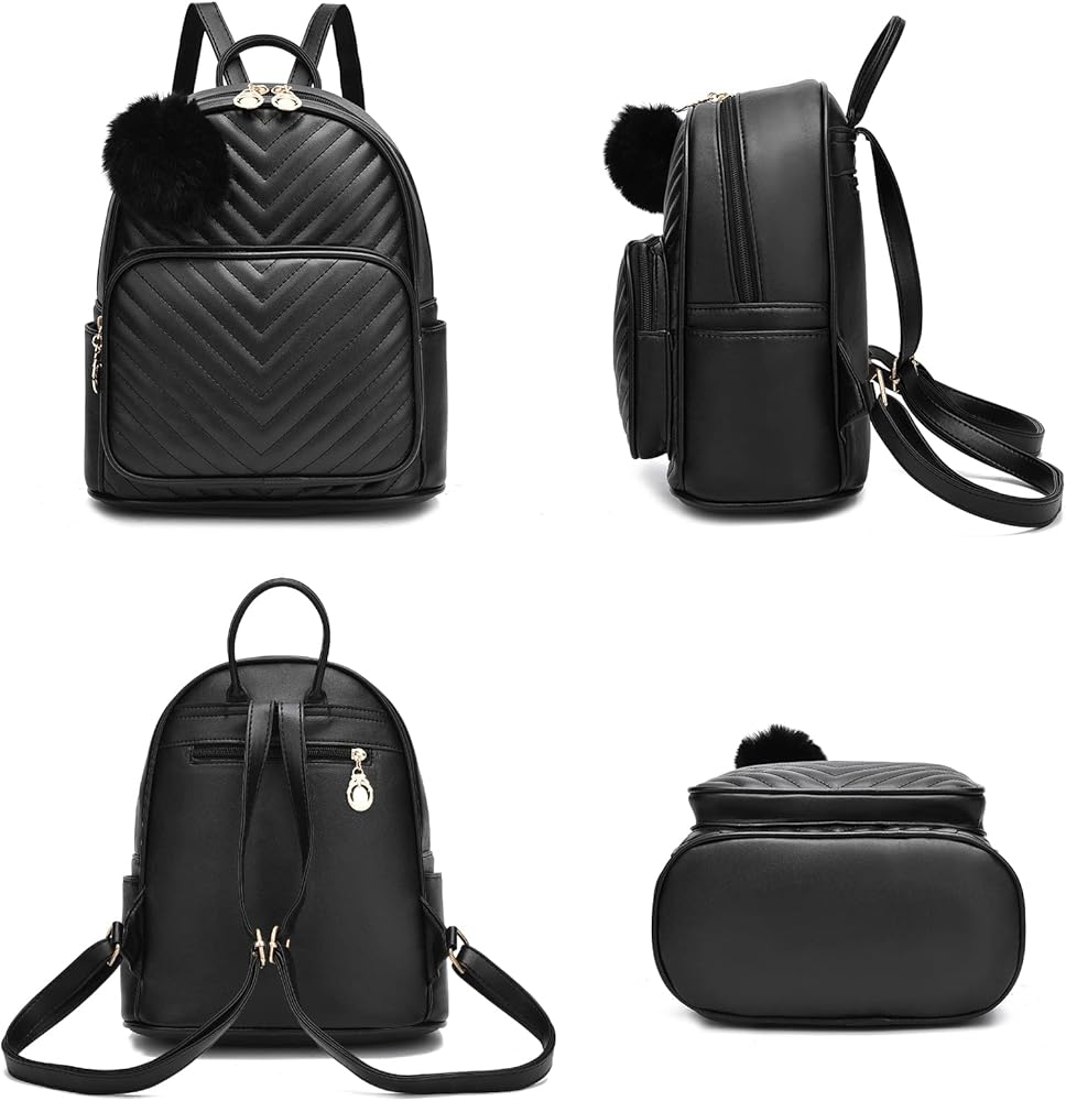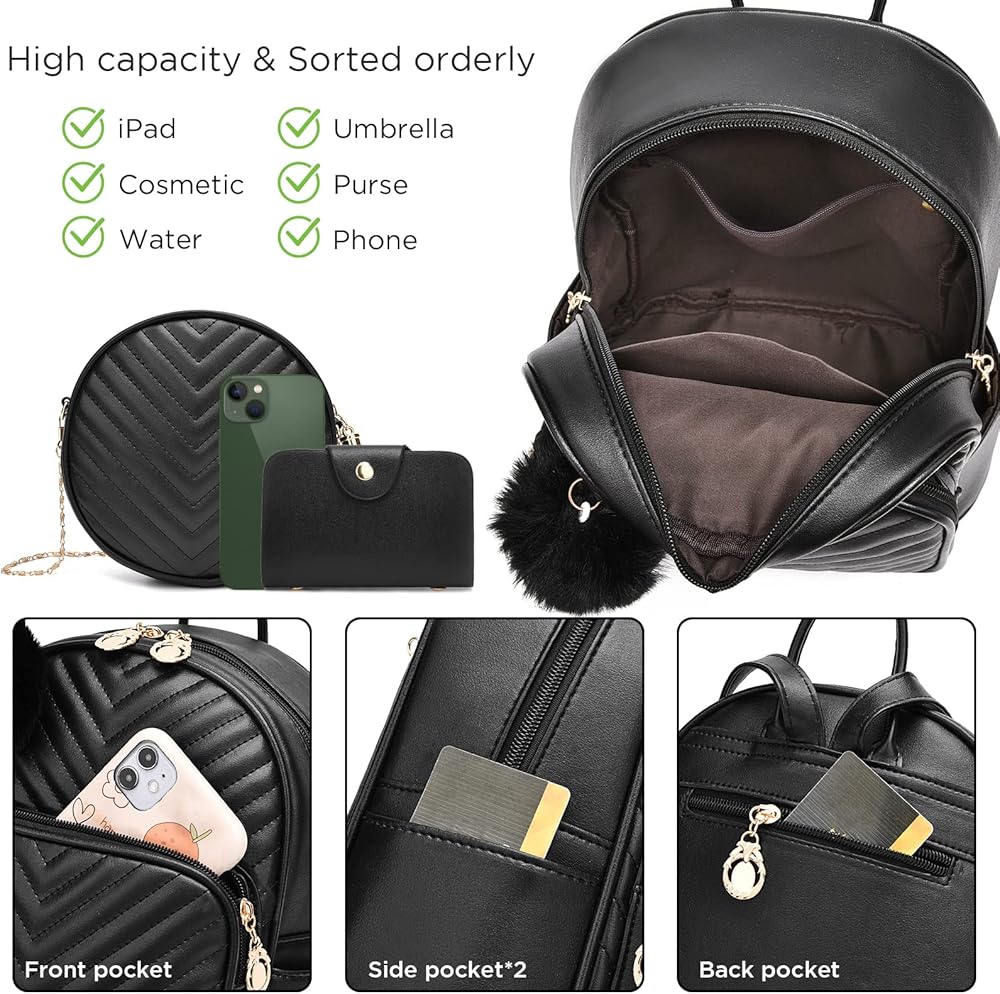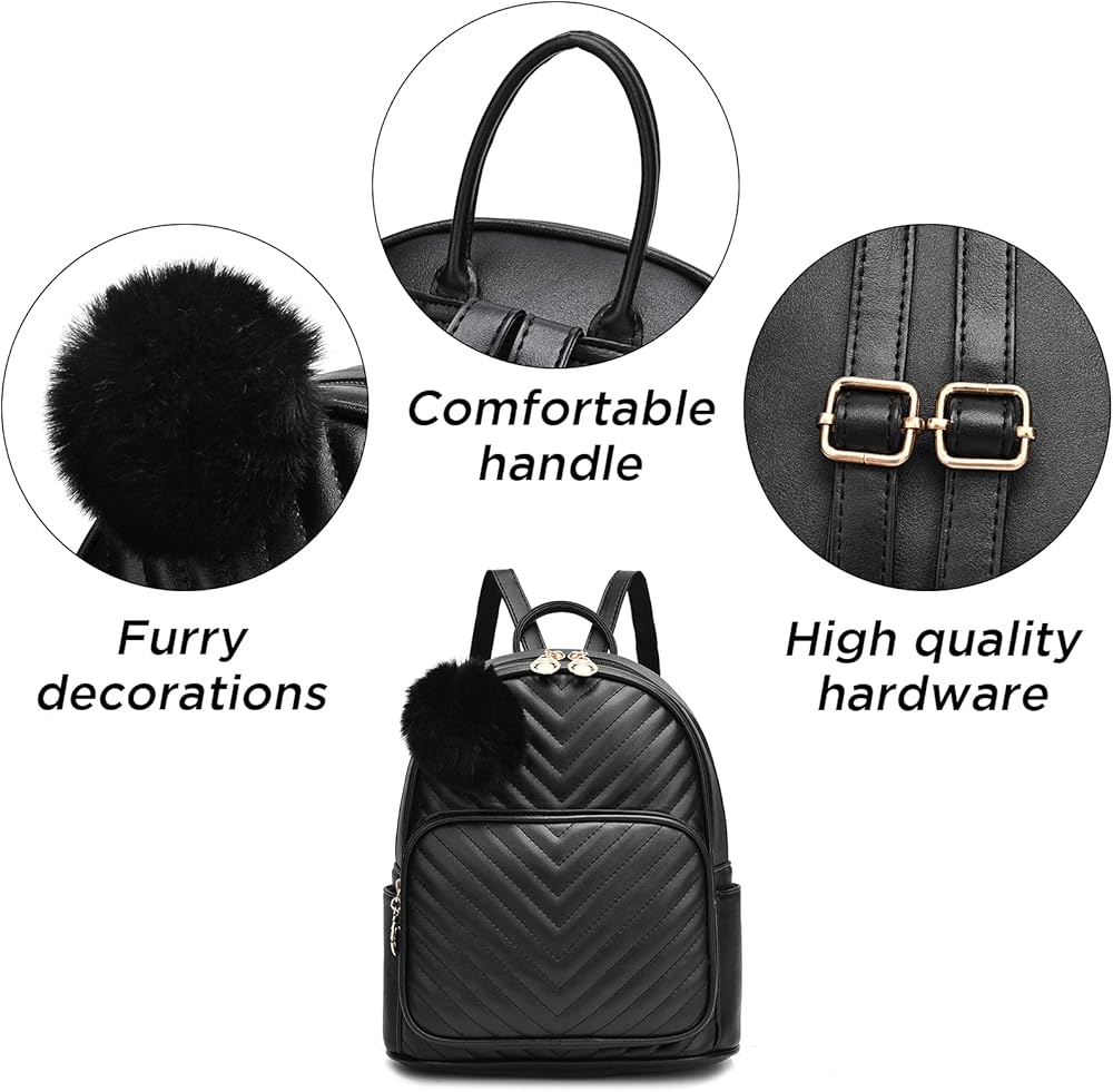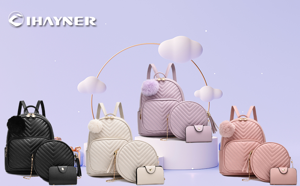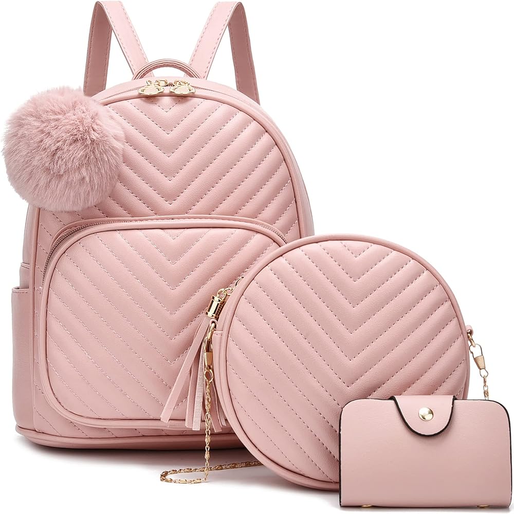 I IHAYNER حقيبة ظهر صغيرة للنساء 3-PCS حقيبة ظهر جلدية محفظة حقائب ظهر صغيرة للنساء السيدات Pompom حقيبة ظهر كتف وردي