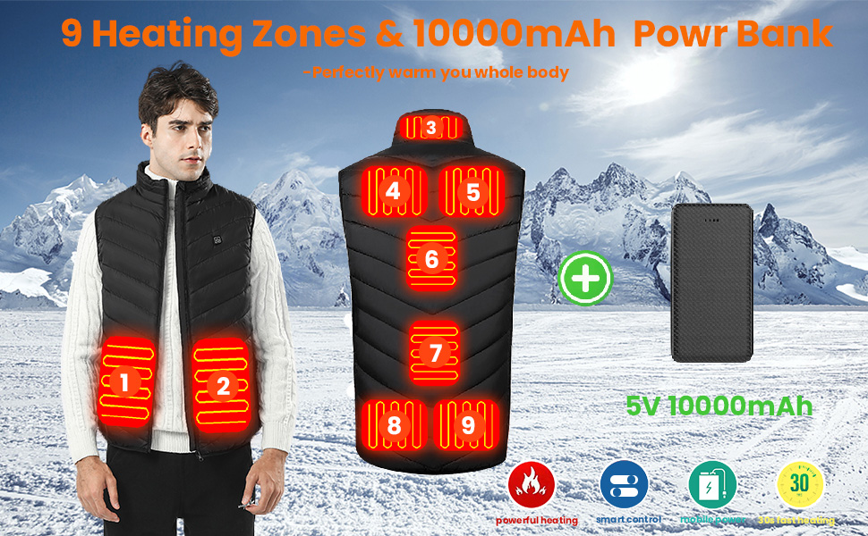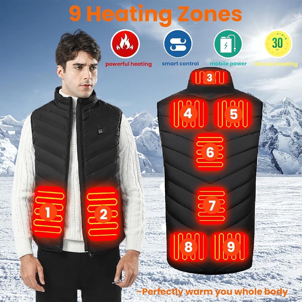 🔥【9 HEATING ZONES&WARM YOUR BODY QUICKLY】The new electric heated vest for men women men is designed with thermal conductive carbon fiber and TPU heating film, with 9 heating zones(2 front and 7 back) to meet your warmth and health needs. The battery heated vest will start heating within 3-5 seconds after startup, quickly warm your body and help promote blood circulation.