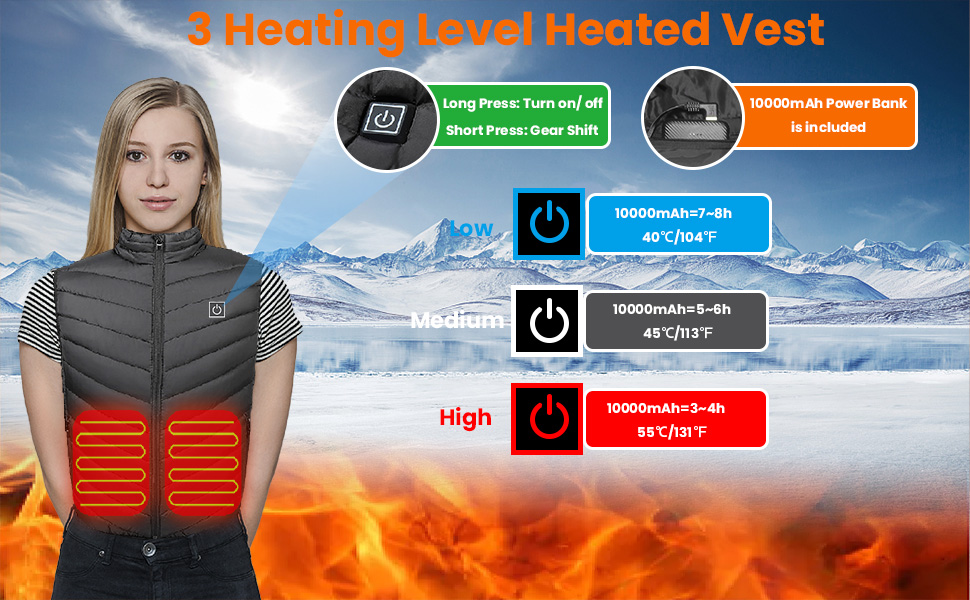 🔥【3 LEVEL HEATING SETTING】The unisix samrt heated vest has been upgraded to the 3 heating level setting. Click the button to select the heating gear: high (red, 55℃/131℉, 3-4 hours), medium (white, 45℃/113℉, 4-5 hours) and low (blue, 40℃/104℉, 7-8 hours). You can choose the heating level according to your needs.
