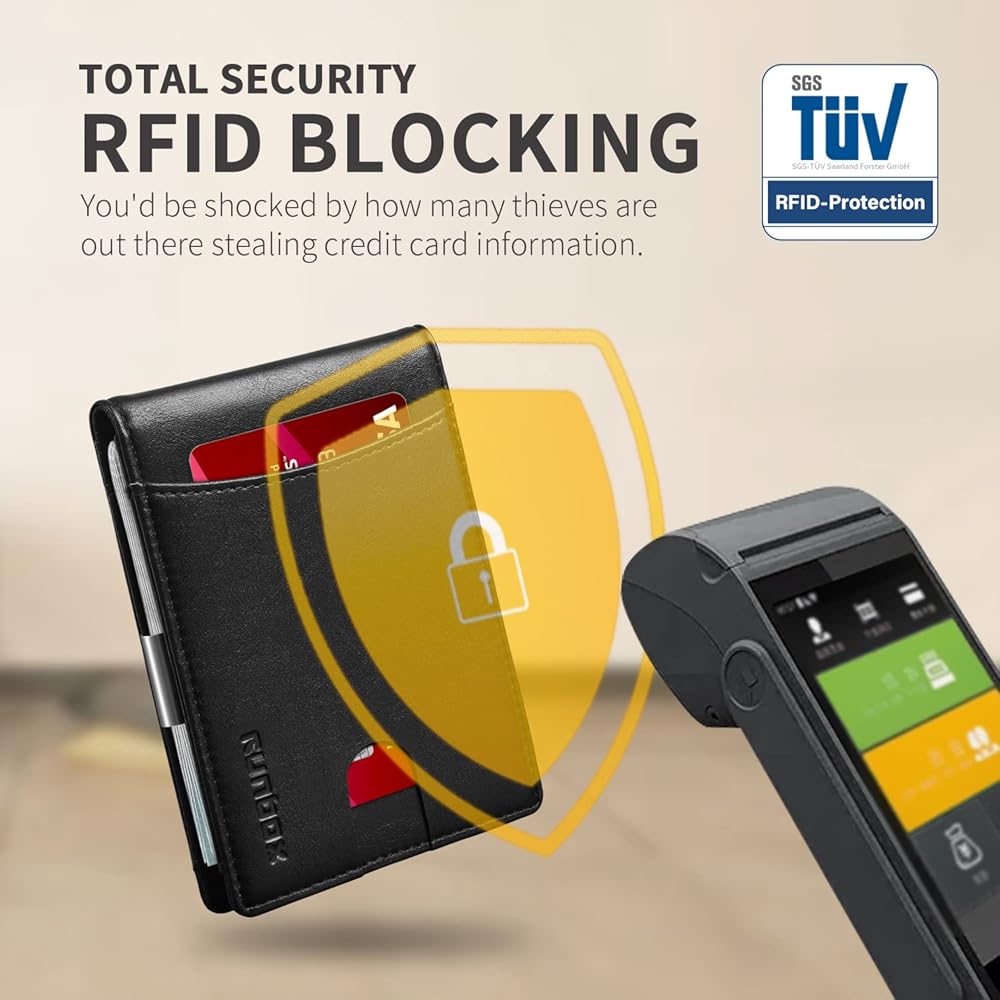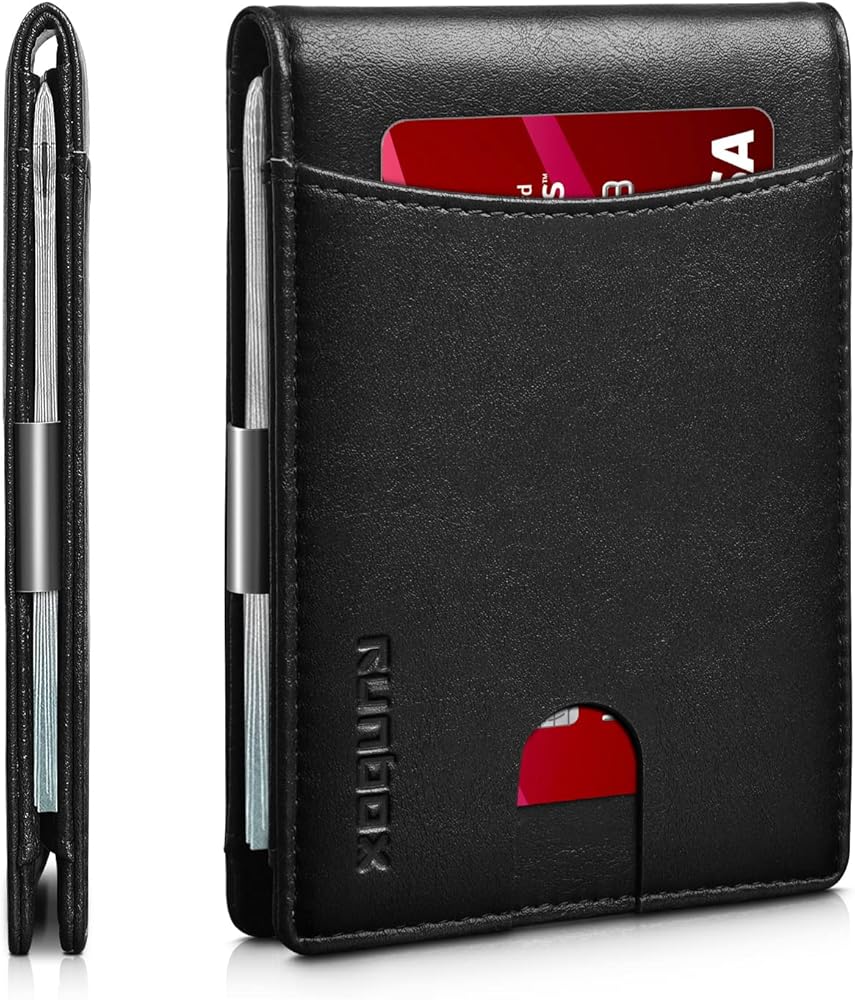 رونبوكس محافظ جلدية رفيعة للرجال مزودة بمشبك نقود بتقنية تحديد الهوية بموجات الراديو مع صندوق هدايا, الجيل الأول من الجلد الأسود - 11 فتحة, مُبسط