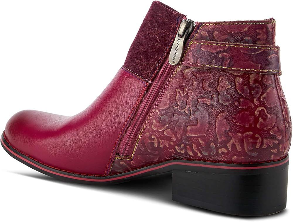 حذاء كاحل مستوحى من فرنسا مصمم بمزيج من الجلد المنقوش يدويًا، والجلد الناعم والجلد المدبوغ الناعم، ويتميز بحزام غير متماثل مزخرف مع إبزيم عتيق على نعل مخيط بلونين وكعب مسطح مسطح.