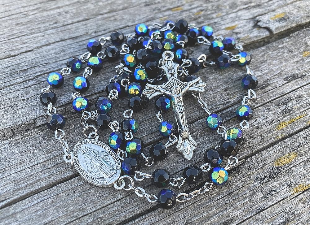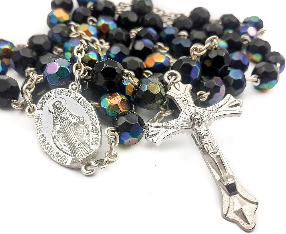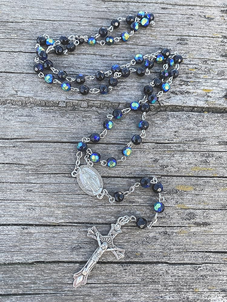 مسبحة خرز كريستالي أسود وأزرق متعدد الألوان، مسبحة روحية كلاسيكية بطول إجمالي 20 بوصة. مسبحة مصنوعة يدويًا متصلة بـ 59 خرزة صلاة مصنوعة للصلاة المسيحية ونظرًا لحجمها، يمكن أيضًا ارتداؤها حول الرقبة كقلادة. فضي 1.6 بوصة صليب وميدالية مصنوعة من سبائك الزنك المطلية بالفضة، متينة بشكل استثنائي تمنع التآكل والتشويه، ومصممة للثبات أثناء الاستخدام اليومي. حجم الصليب (الارتفاع × العرض): 4 سم × 2.5 سم / 1.6 بوصة × 1 بوصة، طول المسبحة 21 بوصة، الخرز 6-7 مم، معبأة في حقيبة مخملية واقية. إكليل روحي يستخدم كمسبحة للصلاة والتأمل أو قلادة دينية، إنها هدية رائعة لأي مناسبة، أو أعياد الميلاد، أو التأكيد، أو المناولة الأولى، أو المعمودية، والهدية المثالية للأصدقاء أو أفراد الأسرة، تناسب الرجال والنساء بشكل رائع.