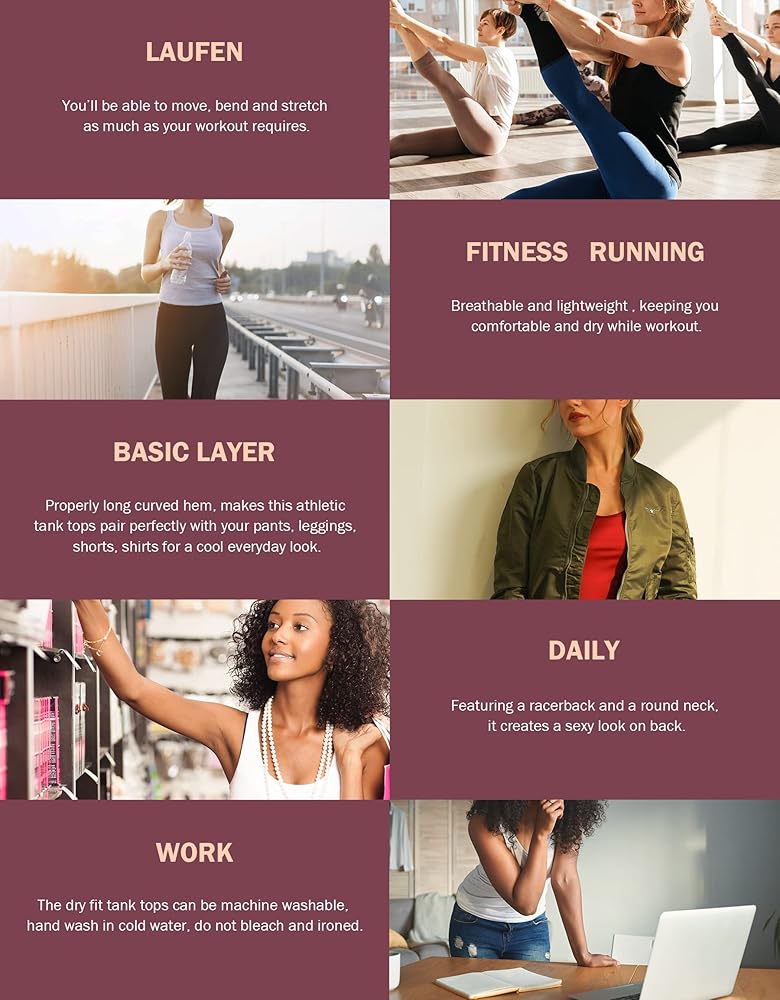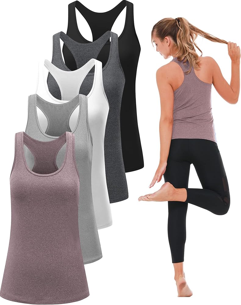TELALEO 5 قطع من قمصان التدريبات للنساء، قمصان رياضية بدون أكمام رياضية بظهر متسابق، قمصان مضغوطة جافة بدون أكمام أسود/رمادي/أبيض/رمادي فاتح/أرجواني 2XL