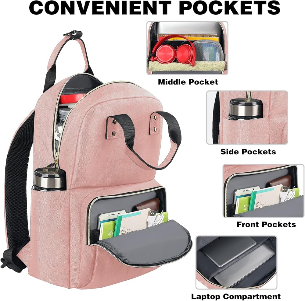 【سعة كبيرة ومقاومة للماء】: الأبعاد الخارجية: 16 × 13 × 6 بوصة، السعة: 28 لتر، وزن المنتج: 1.1 رطل. حقيبة ظهر الكمبيوتر المحمول النسائية مقاومة للماء، مما يضمن بقاء الكمبيوتر المحمول وملفاتك جافة في المطر الخفيف (انتبه إلى السحاب الواقي). حقيبة ظهر نسائية خفيفة الوزن للسفر مع حافظة كمبيوتر محمول سميكة في الجيب الرئيسي، وتوفر مساحة آمنة ومقاومة للصدمات لجهاز الكمبيوتر المحمول والكمبيوتر اللوحي مقاس 15.6 بوصة (15.6 بوصة وما فوق)