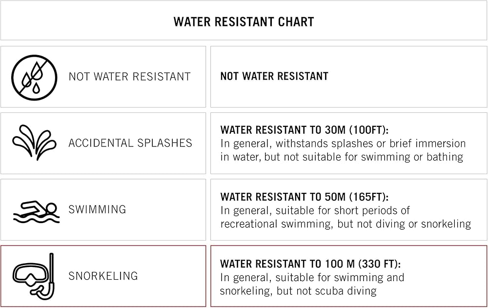 - مقاومة للماء حتى 100 متر (330 قدم): بشكل عام، مناسبة للسباحة والغوص تحت الماء، ولكن ليس الغطس لمسافات بعيدة