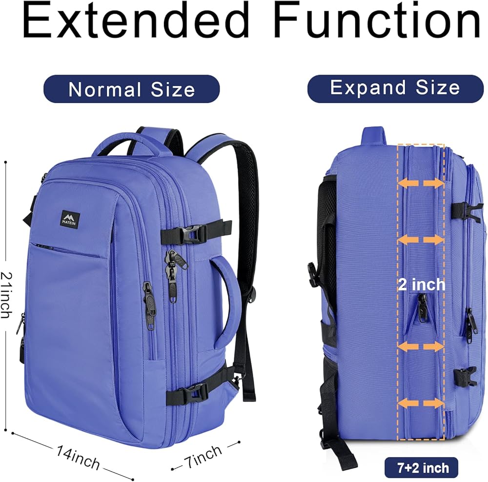 ✈【سعة كبيرة وقابلة للتوسيع】: الحجم العادي: 21*14*7 بوصة، بعد التوسيع: 21*14*9 بوصة. توفر لك حقيبة السفر الكبيرة جدًا المزودة بميزة قابلة للتوسيع سعة تعبئة أكبر تصل إلى 50 لترًا. يمكن فتح السحاب للحصول على مساحة تخزين أكبر، ويمكنه حمل معدات السفر لمدة 3-7 أيام. تأتي حقيبة الظهر المحمولة المعتمدة من إدارة أمن المواصلات الأمريكية مع سحاب إغلاق 180 درجة يساعدك على اجتياز الفحص الأمني بسرعة. حقيبة الظهر المخصصة للسفر تلبي معظم متطلبات شركات الطيران المحمولة كما أنها تناسب المقصورة العلوية وتحت المقعد