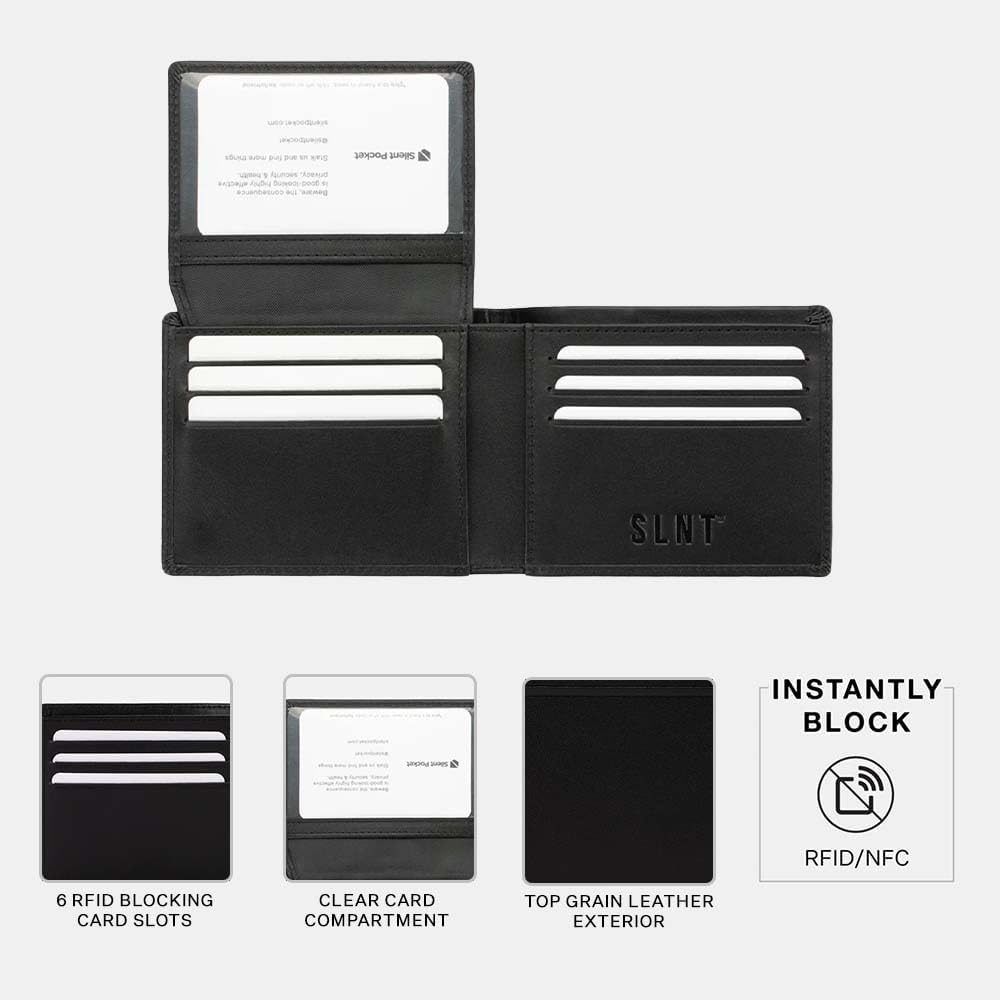 محفظة رجالية من الجلد SLNT RFID وNFC تحجب الإشارة فوق غطاء قلاب - 6 فتحات لبطاقات الائتمان، فتحة لبطاقة الهوية وجيب للنقود - تمنع القرصنة وسرقة الهوية - مظهر نحيف، رائعة للسفر (أسود داكن)