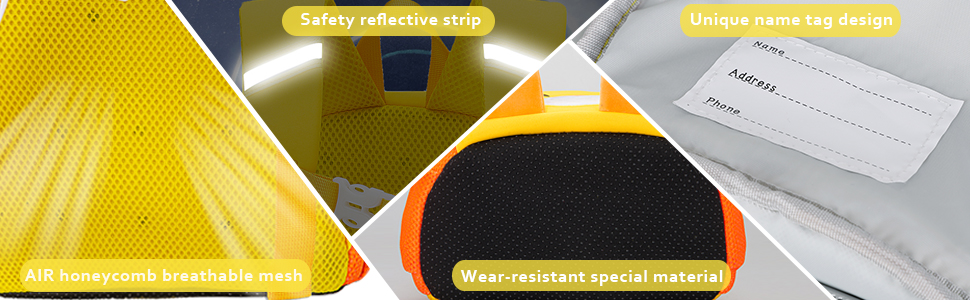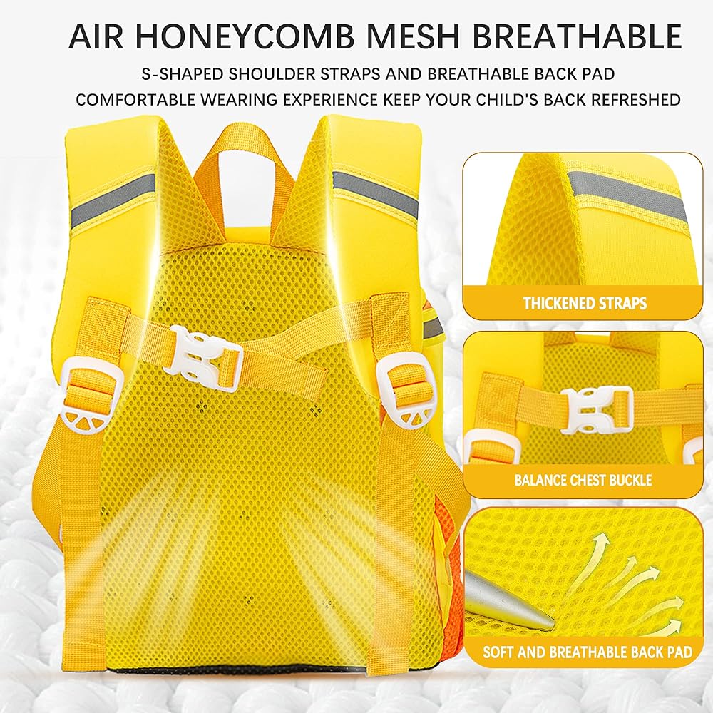 [ERGONOMIC DESIGN]Ergonomically designed S-shaped thickened shoulder straps and soft and breathable back pads, made of AIR honeycomb breathable mesh material, provide a comfortable and fitting wearing experience, reduce the pressure on children's shoulders and back.[REFLECTIVE STRIP DESIGN]The front of the backpack and the shoulder straps are designed with reflective strips, which can reflect light at night and make children's nighttime travel safer.