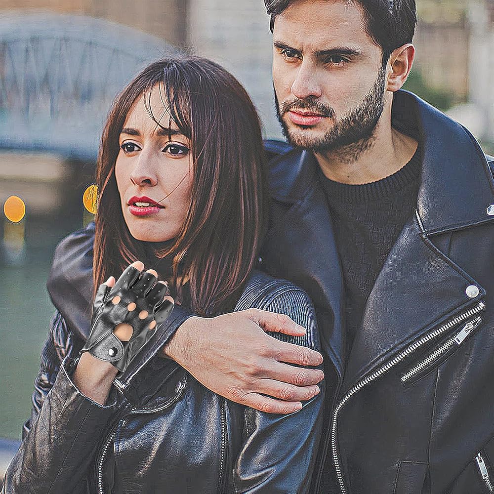 مادة مريحة: قفازات راكبي الدراجات النارية السوداء مصنوعة من جلد البولي يوريثان الصناعي عالي الجودة، وليس جلد أصلي، خفيفة الوزن ومتينة، وناعمة، ومرنة، ومريحة، ومسامية، مع تصميم قصير بنصف إصبع، أنيقة وعصرية.