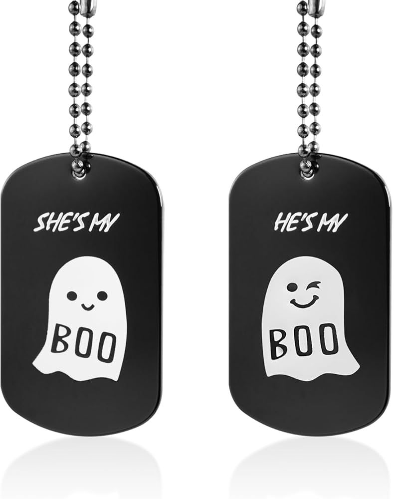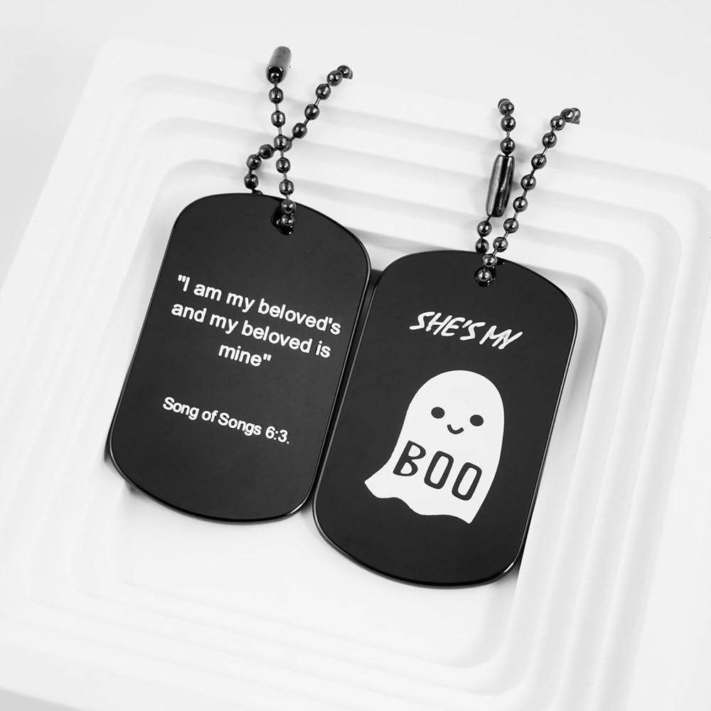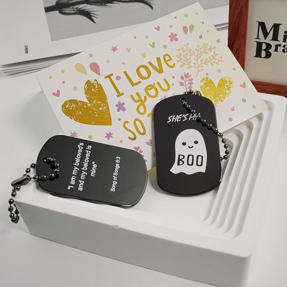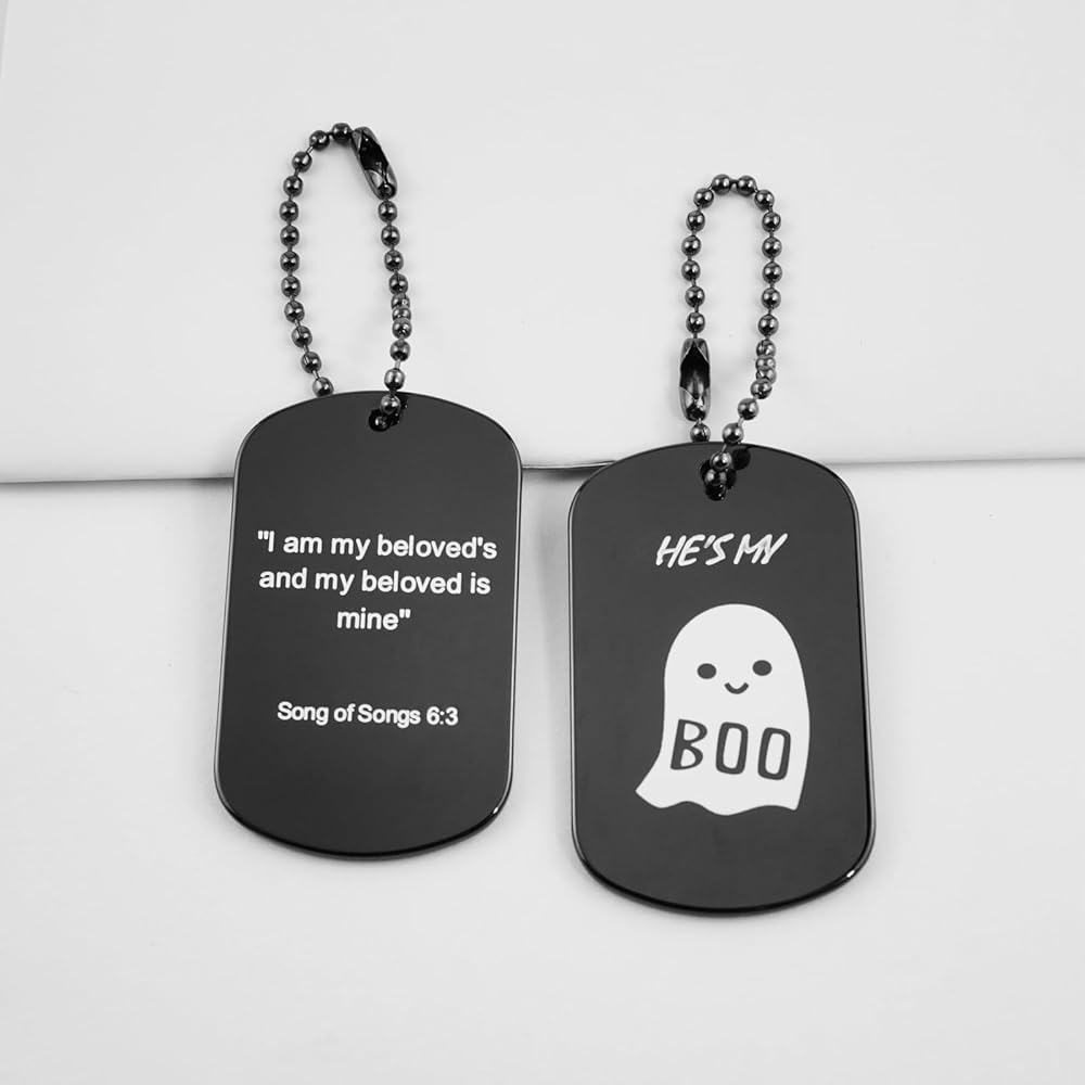 احتفل برباطك الخاص مع هدايا العلاقات الرائعة التي نقدمها للأزواج. نقدم لكم سلسلة المفاتيح متعددة الاستخدامات التي يمكن استخدامها كقلادة، وتتميز بتصميم فريد منقوش عليه عبارة "SHE IS MY BOO" و"HE IS MY BOO" و"أنا لحبيبي وحبيبي لي" "أغنية الأغاني 6:3". يعد هذا الملحق الاستثنائي بمثابة تذكير يومي بعلاقتك العميقة وعاطفتك.