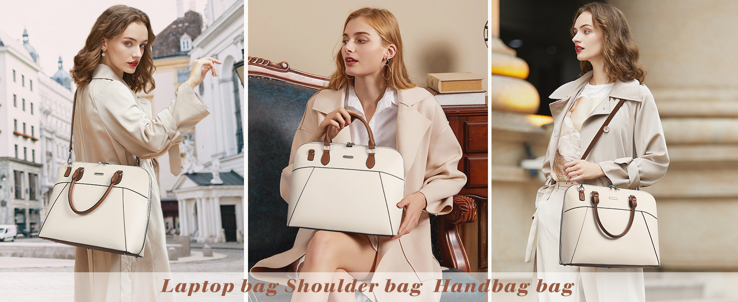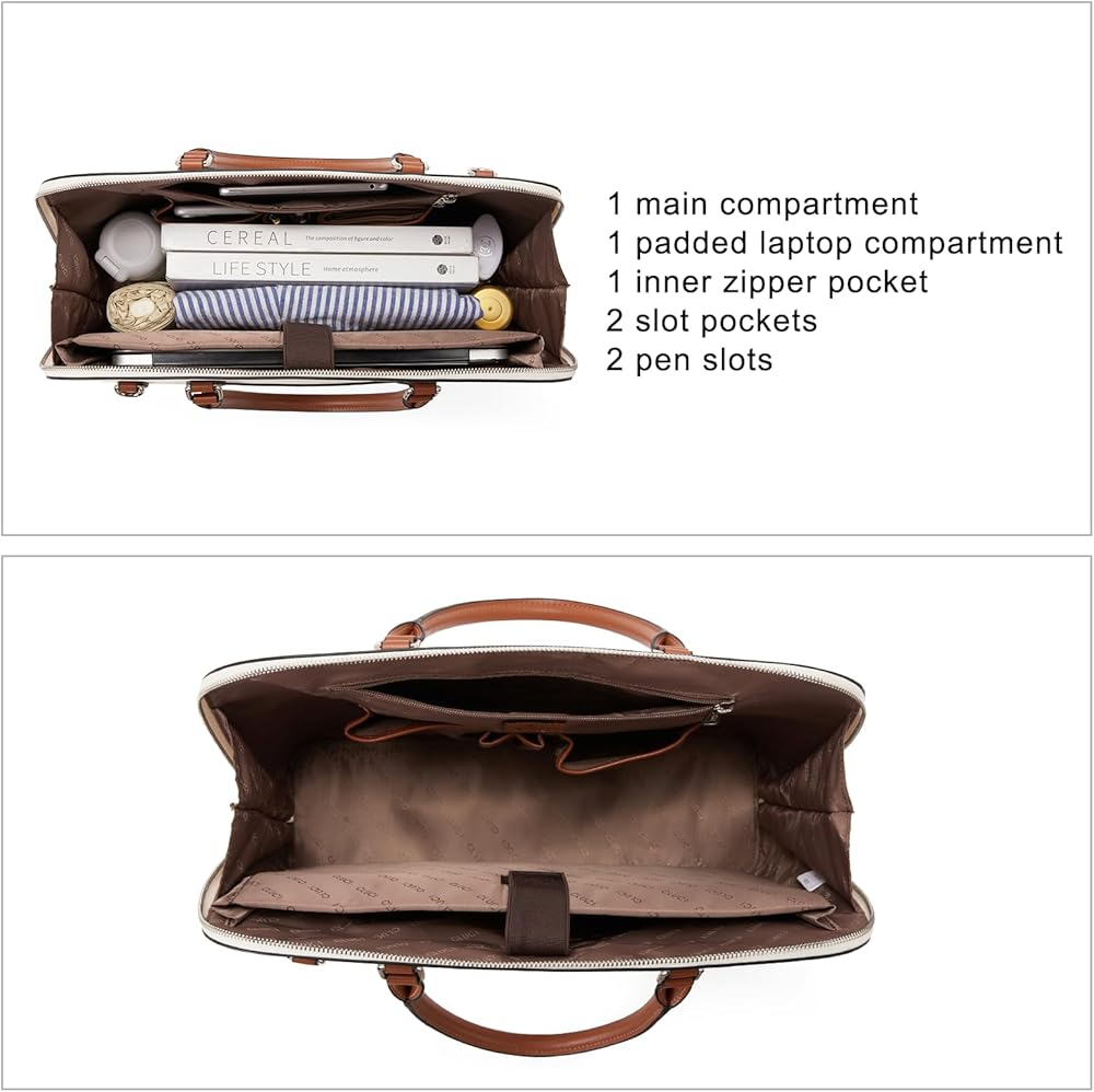 LARGE CAPACITY - 1 zipper closure compartment, 1 padded compartment for 15.6" laptop or under laptop, 2 open slot pockets, 2 pen loops, 1 internal zipper pocket. The leather laptop bag for women is so spacious that it can carry computers, iPad, files, textbooks as well as other small items.