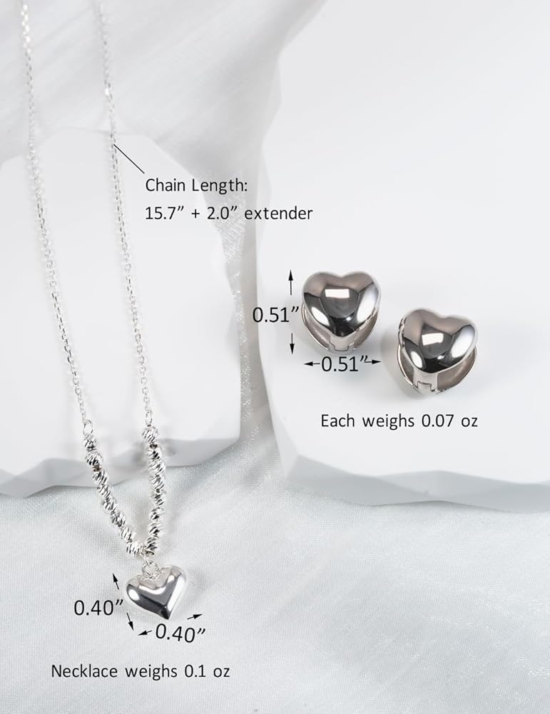 Size and weight: The heart choker necklace measures a 0.40" L × 0.40" W pendant and a 15.7" L chain with a 2.0" L extender, weighing 0.1 oz. Each silver earring measures 0.51" L x 0.51" W and weighs 0.07 oz