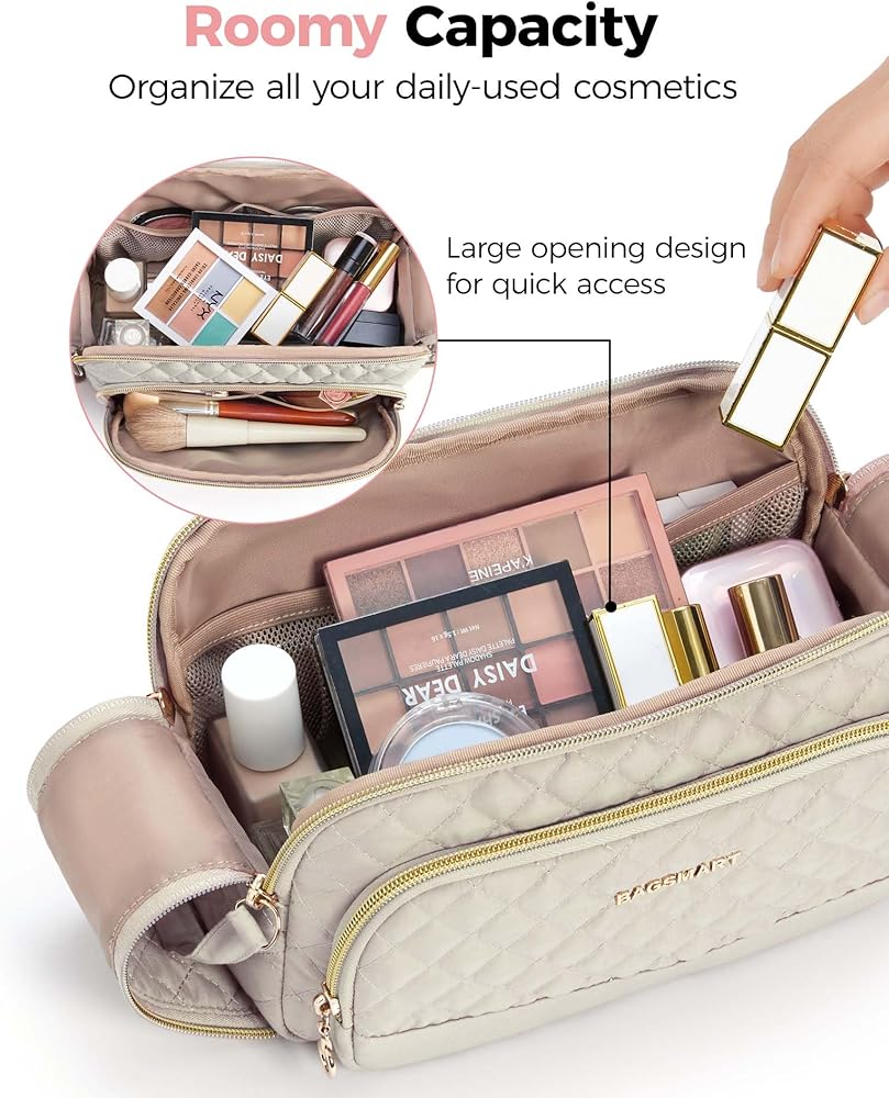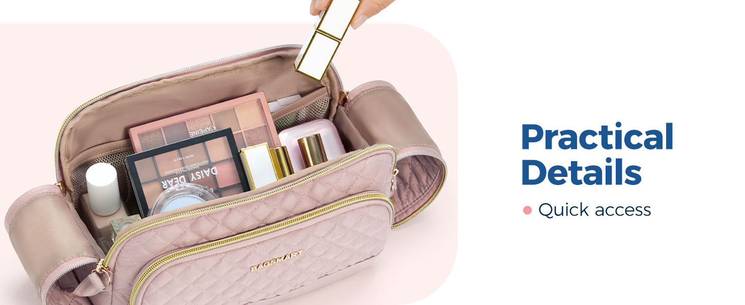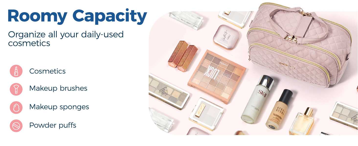 تصميم لسهولة الوصول: توفر حقيبة المكياج ذات الفتحة الواسعة ذات السحاب المزدوج إمكانية الوصول بسهولة إلى أساسيات التجميل الخاصة بك. مع حقيبة المكياج النسائية هذه، يمكنك بسهولة العثور على مستحضرات التجميل المرغوبة، مثل أحمر الشفاه أو ظلال العيون، مما يوفر وقتك ويضمن مظهرًا واثقًا دون أي متاعب أثناء سفرك.