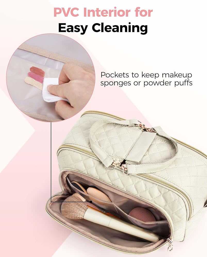 حقيبة مكياج فاخرة للسفر: حقيبة المكياج النسائية هذه مصنوعة من قماش مبطن مقاوم للماء، وتتميز بمقبض حمل مريح لسهولة النقل. إنه مغلف بقماش غير منسوج يعزز متانته وبنيته، مما يضمن حماية استثنائية لمستحضرات التجميل الخاصة بك.