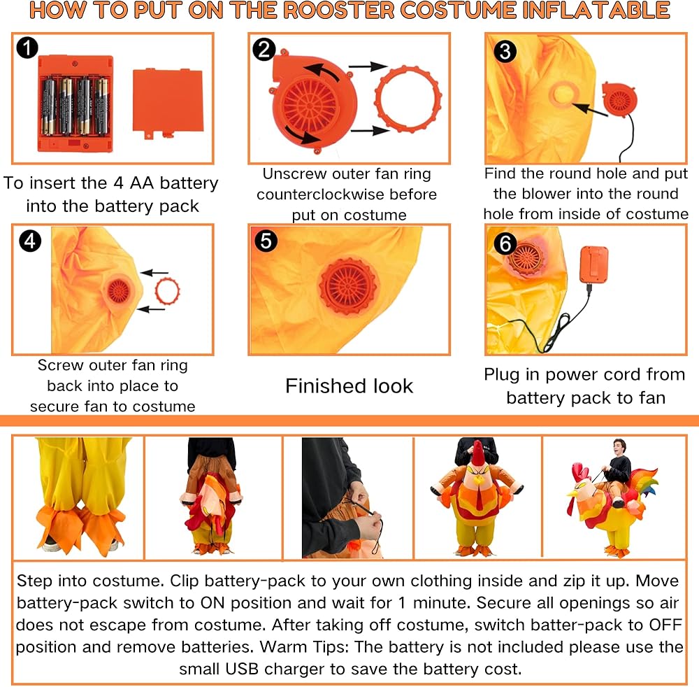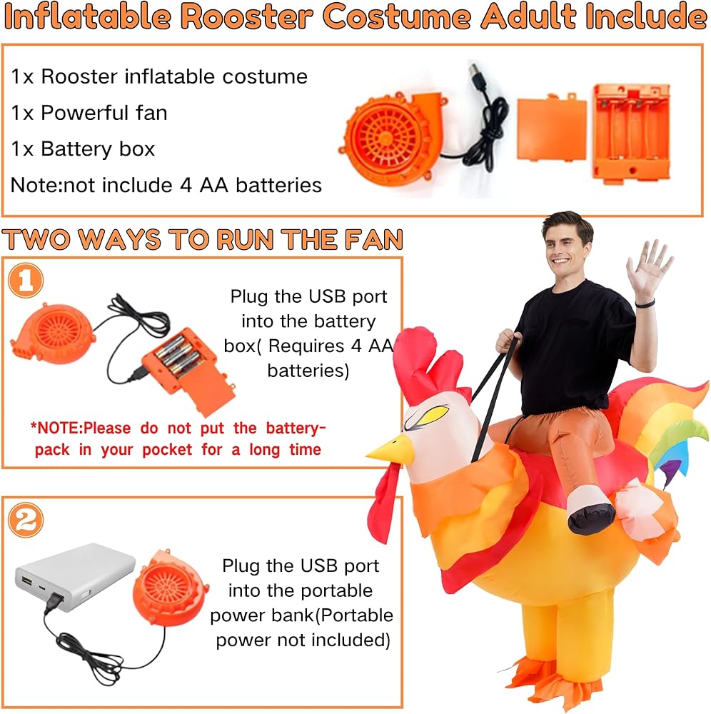 • تتضمن العبوة وتنبيه: تتضمن زي ركوب الدجاج للبالغين مع مروحة طاقة وحزمة بطارية (البطاريات غير متضمنة). لذلك تحتاج إلى شراء 4 بطاريات AA بنفسك، ويمكنك أيضًا توصيل منفذ USB الخاص بالمروحة بمصدر الطاقة المحمول عالي السعة أو بنك الطاقة للحفاظ على دوران المروحة لفترة أطول. ملحوظة: يرجى تثبيت حزمة البطارية على الحزام، وعدم وضعها في جيبك وإلا سيسخن الجهاز ويحرق ساقك