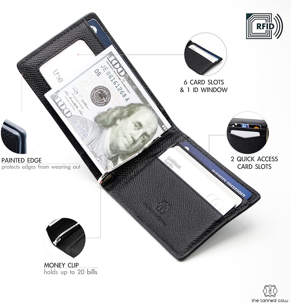 هدية رائعة: قم بشراء محفظة بمشبك نقود لنفسك أو لشخص تهتم به. تعتبر المحفظة الجلدية ثنائية الطي للرجال هدية رائعة كحامل بطاقة ائتمان مع مشبك للنقود يمكن استخدامها في أي مناسبة وستدوم إلى الأبد! الهدية المثالية أسهل مما تعتقد. مع محفظتنا ذات مشبك النقود، نجعل من السهل تقديم أفضل هدية يمكن تخيلها من خلال وضعها في صندوق هدايا، وحقيبة قماشية، وبعض ورق التغليف الأنيق!
