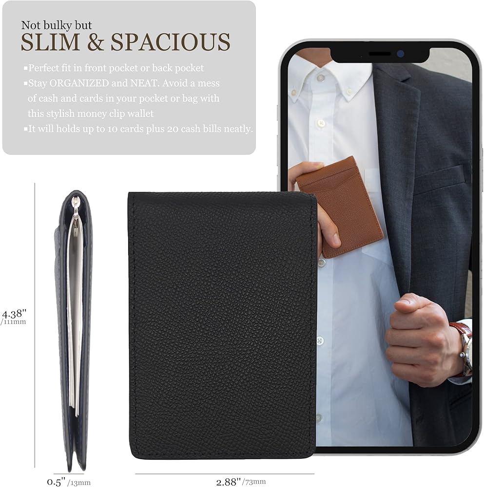 رفيعة ولكن واسعة: لا نحتاج إلى المزيد من المحافظ الضخمة لأن هذه المحفظة البسيطة تحتوي على العديد من الفتحات للبطاقات ومشبك النقود المتين. محفظتنا الجلدية البسيطة وعالية الجودة مثالية لحمل أهم أغراضك. يمكن لمحفظة الرجال الرفيعة أن تحمل ما يصل إلى 11 بطاقة و15-20 ورقة نقدية. تحتوي المحفظة الصغيرة الداخلية على 6 فتحات للبطاقات، وفتحة واحدة لبطاقة الهوية ومشبك للنقود. لدى رجال المحفظة أيضًا فتحتان لعربة التسوق السريعة بالخارج! أبعاد المحفظة الرفيعة هي: 2.95 بوصة × 4.25 بوصة × 0.5 بوصة.