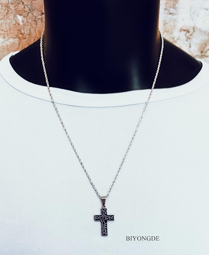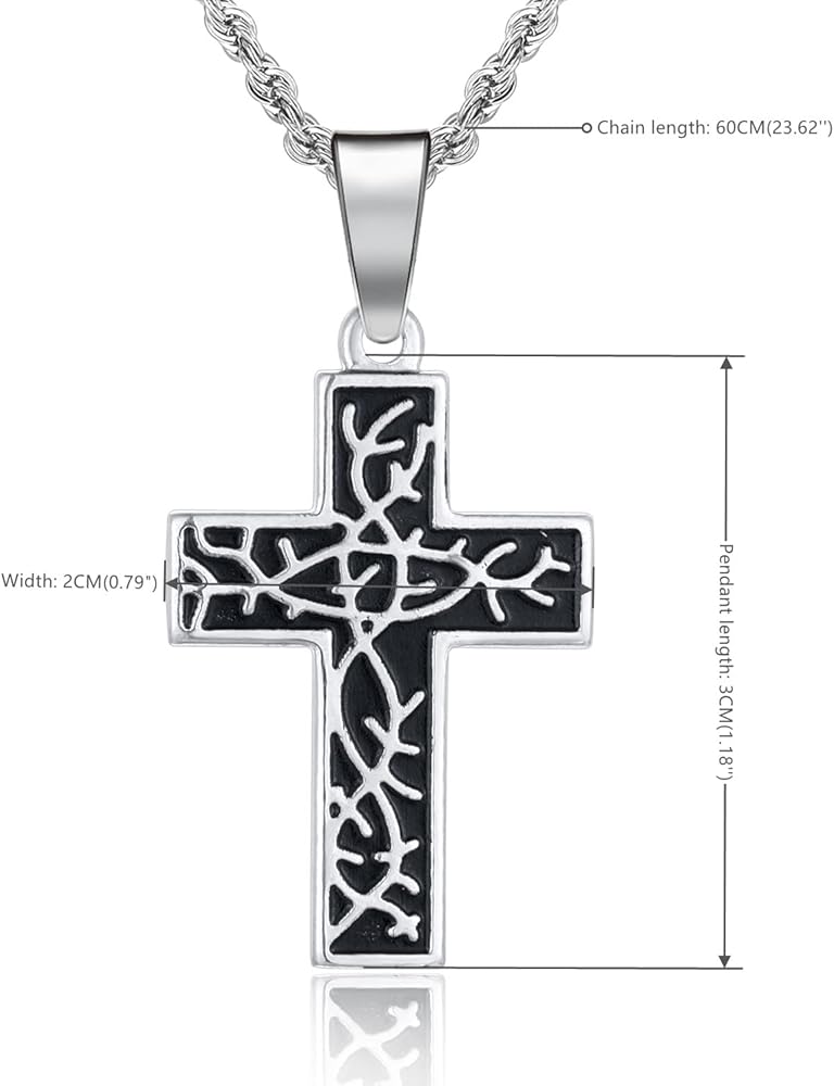 BIYONGDE الشوك الصليب قلادة قلادة، 24 بوصة سلسلة قلادة، فضي أسود الفولاذ المقاوم للصدأ للرجال والنساء