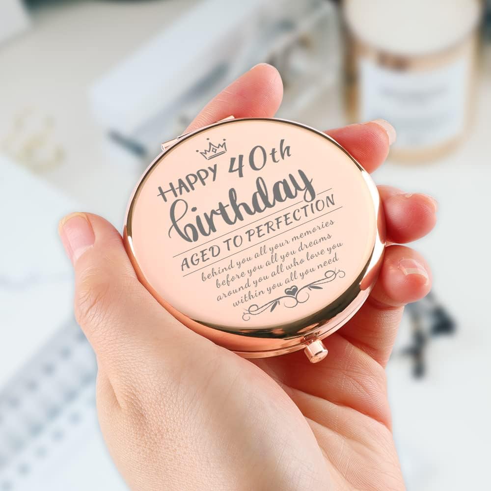 [هدايا عيد ميلاد للمرأة الأربعين]: 1 × مرآة صغيرة رائعة بلون ذهبي وردي، منقوشة بكلمات "Happy 40th birthday to perfect behind you all your memories before you all you dreams ".Turning 40 هي علامة فارقة، يوم يجب تذكره، وقت تشعر فيه بمزيد من الثقة في قدراتك وتستمر في متابعة ما تريد. احتفل بعيد ميلاد مهم مع هذه الهدية الخاصة. ستعيد الذكريات السعيدة عند استخدامها في كل مرة