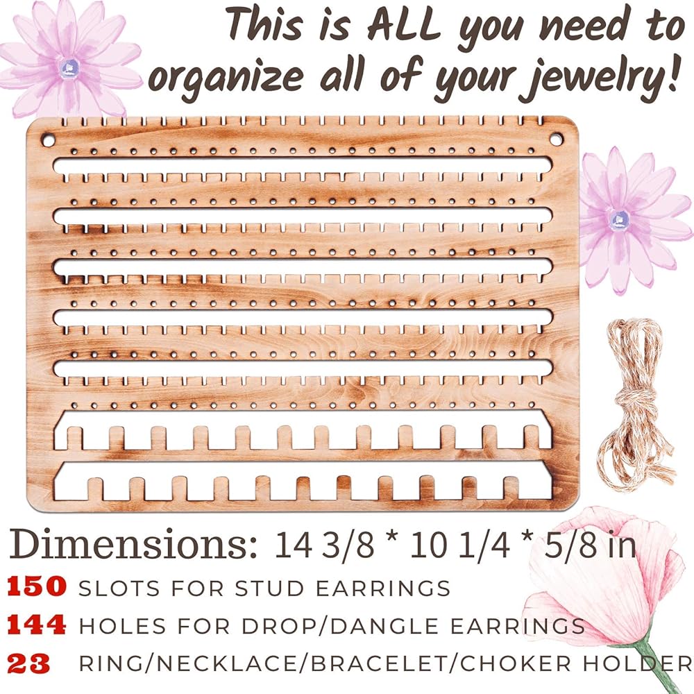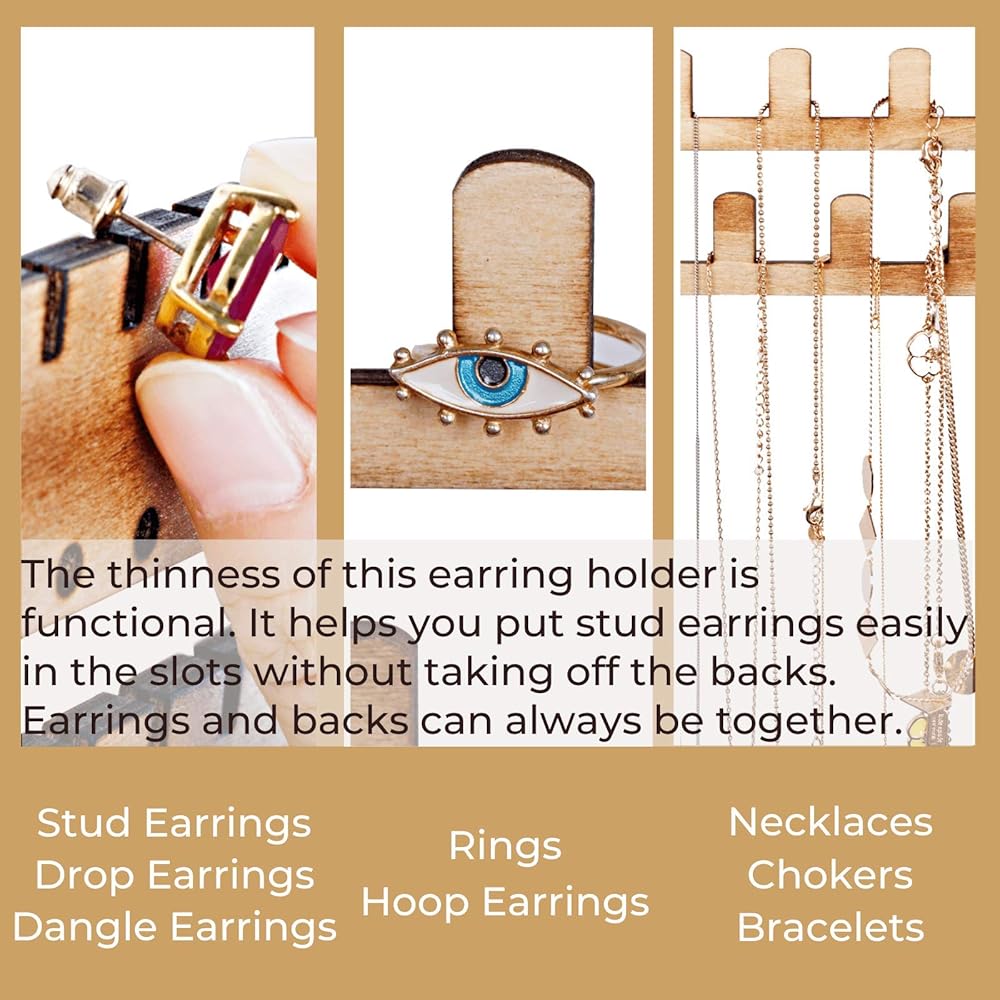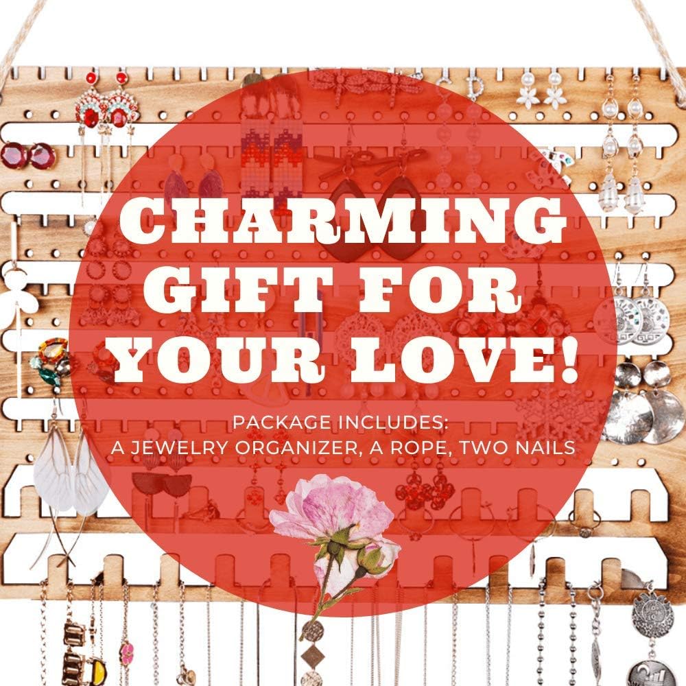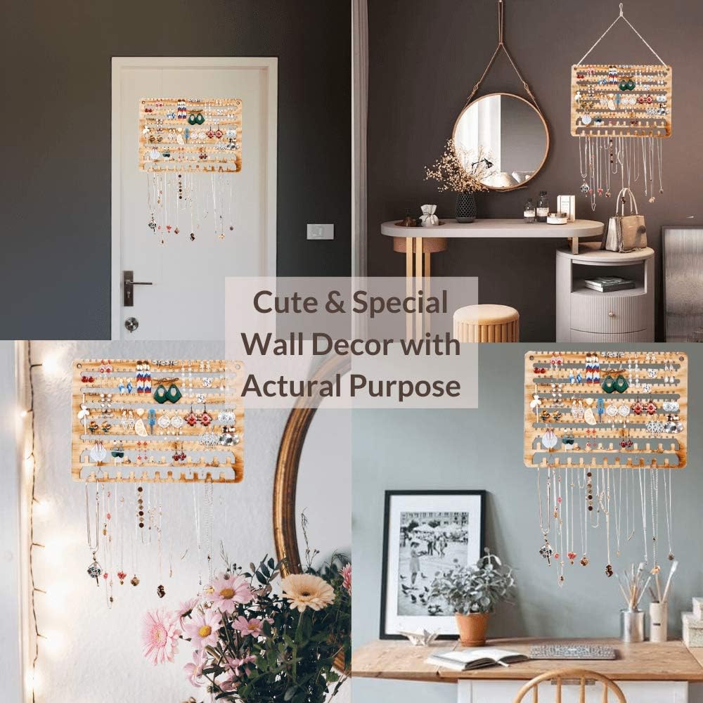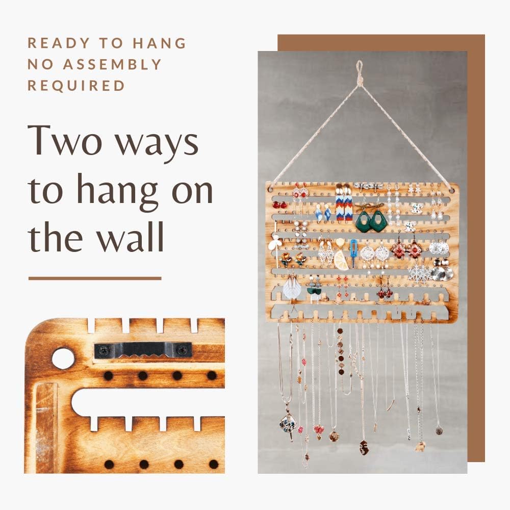 ✔️One for all your jewelries: it comes with 150 slots for stud/pierced earrings, 144 holes for dangle/drop earrings, and 23 ring/necklace/bracelet/bangle/choker holders, and also for hoop earrings. It is PERFECT for your jewelry collections! Your best wall mounted jewelry organizer, earring holder, necklace holder, bracelet holder and ring holder. Display your Jewelry in a stylish way! No more mess, and always be neat and organized!