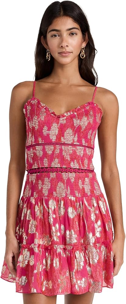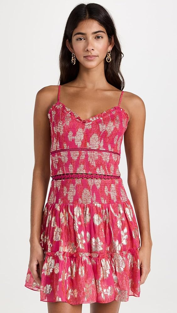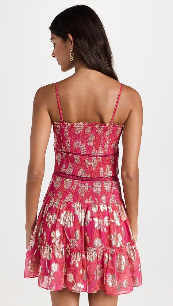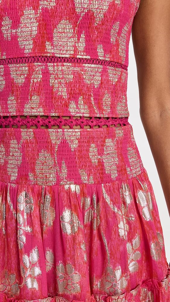 - صدرية مرنة مع زخرفة مطرزة بالكروشيه، وخيوط معدنية ونمط زهور، وأشرطة كتف قابلة للتعديل وزخرفة مكشكشة