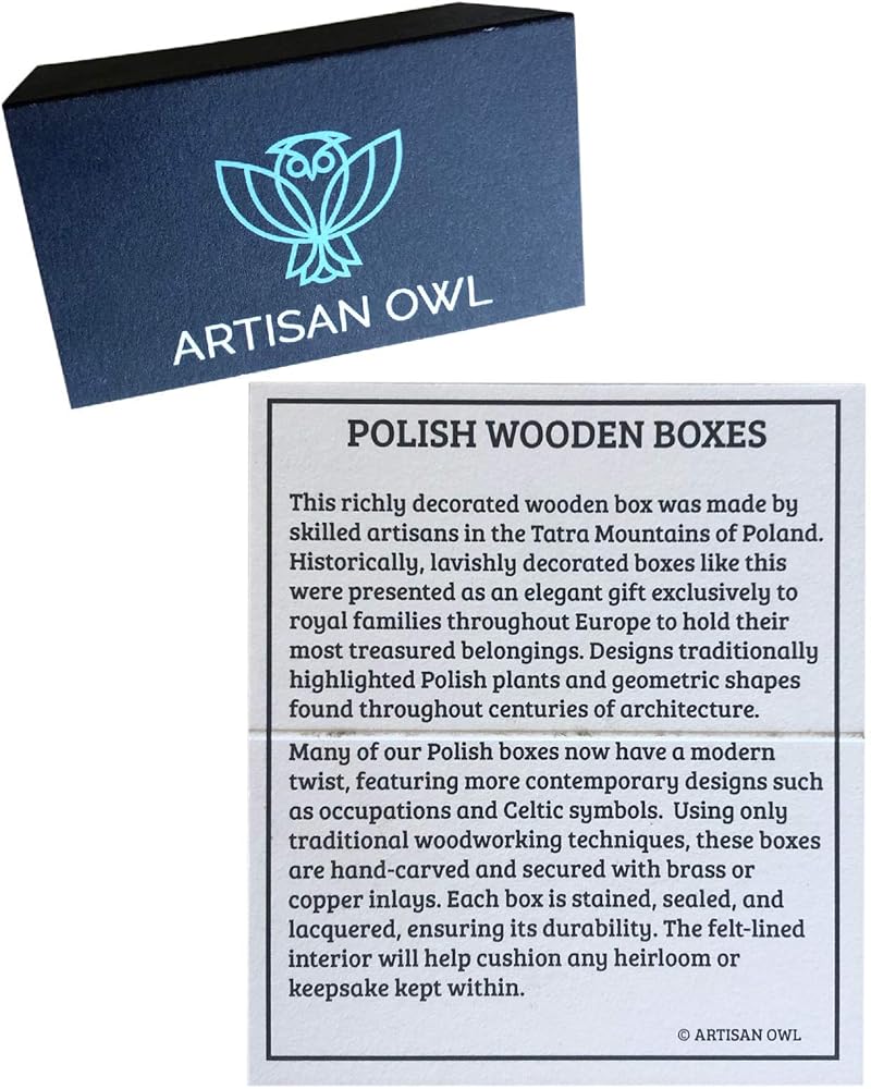 تم صنع هذا الصندوق الخشبي المزخرف بشكل غني على يد حرفيين مهرة في جبال تاترا في بولندا. تاريخيًا، تم تقديم صناديق مزينة بسخاء مثل هذه الهدية كهدية أنيقة حصريًا للعائلات الملكية في جميع أنحاء أوروبا لحمل أمتعتهم الثمينة. تصميمات النباتات البولندية المميزة التقليدية وأشكال هندسية موجودة على مدار قرون من الهندسة المعمارية. العديد من صناديق البولندية لدينا لديها الآن لمسة عصرية ، تتميز بتصاميم أكثر عصرية مثل المهن والرموز السلدية. باستخدام تقنيات الخشب التقليدية فقط، هذه الصناديق منحوتة يدويًا ومأمونة بطبقات نحاسية أو نحاسية. كل صندوق ملون ومغلف بالورنيش مما يضمن متانته. البطانة الداخلية المصنوعة من نسيج اللباد ستساعد على تبطين أي إرث أو تذكار حفظه بداخله.