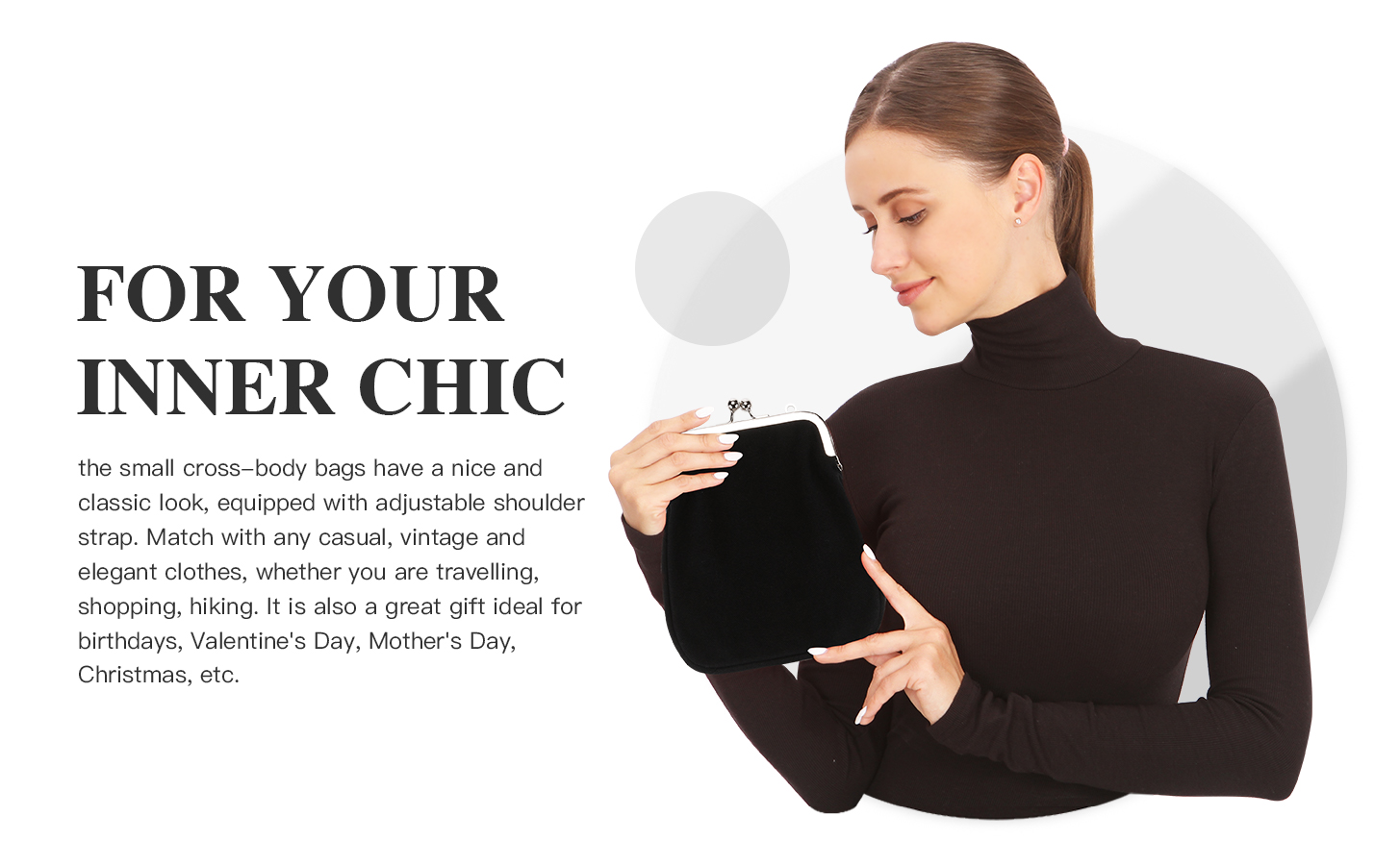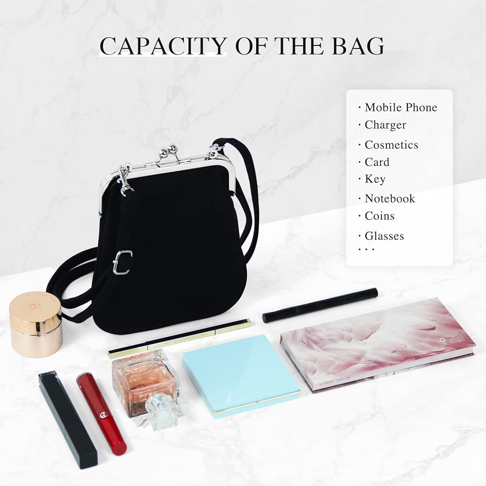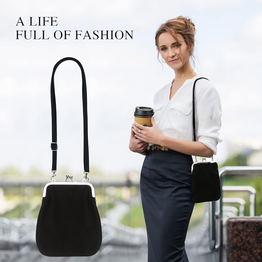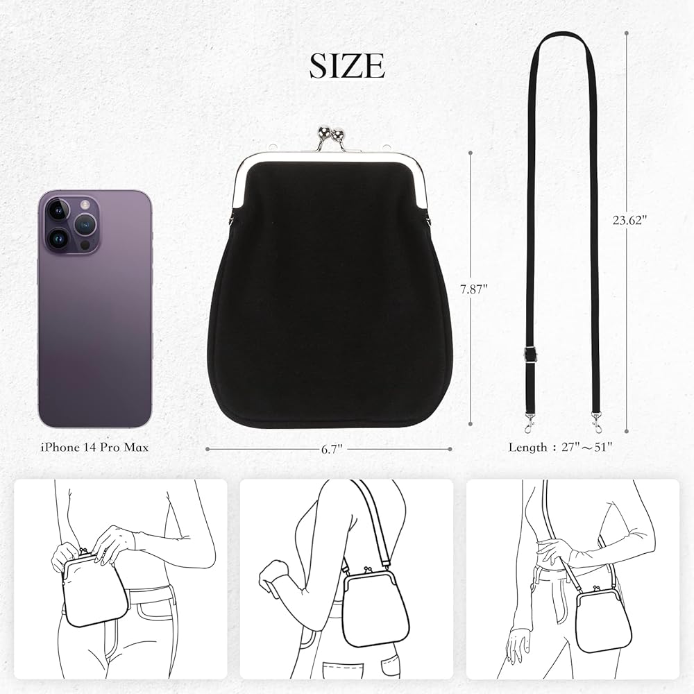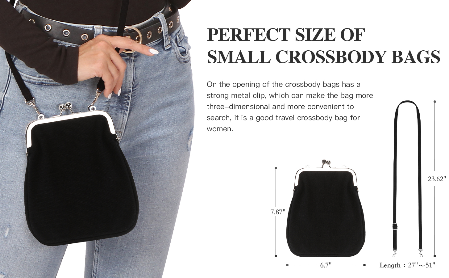 حقيبة طويلة تمر بالجسم باللون الأسود: 6.7 انش (عرض) × 7.87 انش (ارتفاع) / 17 سم (عرض) × 20 سم (ارتفاع)، تزن 6.1 اونصة فقط، حزام كتف قابل للتعديل مع ارتفاع 23.6 انش، حجم مناسب بدون أي ضخامة. شنطة كروس للنساء جيدة للسفر.